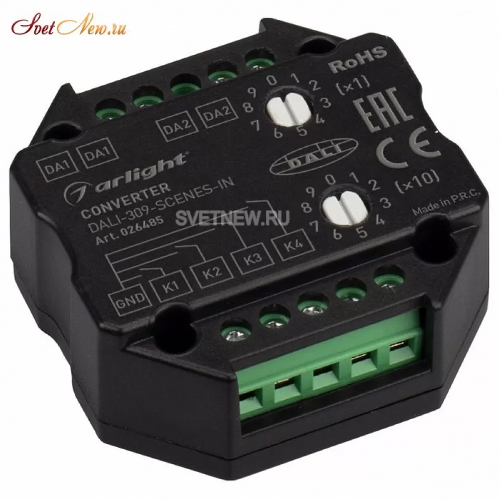 Управляется внешними настенными выключателями, питание по шине DALI, выход - сигнал DALI, 4 сцены. Ручное выставление номера первой сцены. Размер 51х51х22 мм.