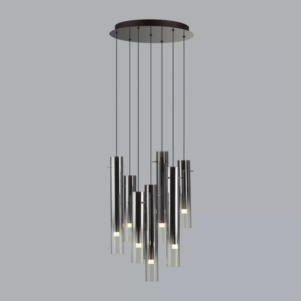 Линия Shiny— коллекция светодиодных элегантных стеклянных подвесов и люстр в 3-х градиентных цветах— янтарный, дымчатый и черный. Оригинальность дизайна моделей состоит в том, что внутри стеклянного плафона находится металлическая трубка цвета никель с LED источником. Красивое наложение цветов металла и стекла и дает изысканный эффект этого сочетания. Стеклянные плафоны-трубки имеют две длины: 320мм и 450мм, что позволяет создавать красивые разноуровневые композиции.В коллекции есть каскадные люстры на базе подвесов. Цветовая температура LED -3000К.