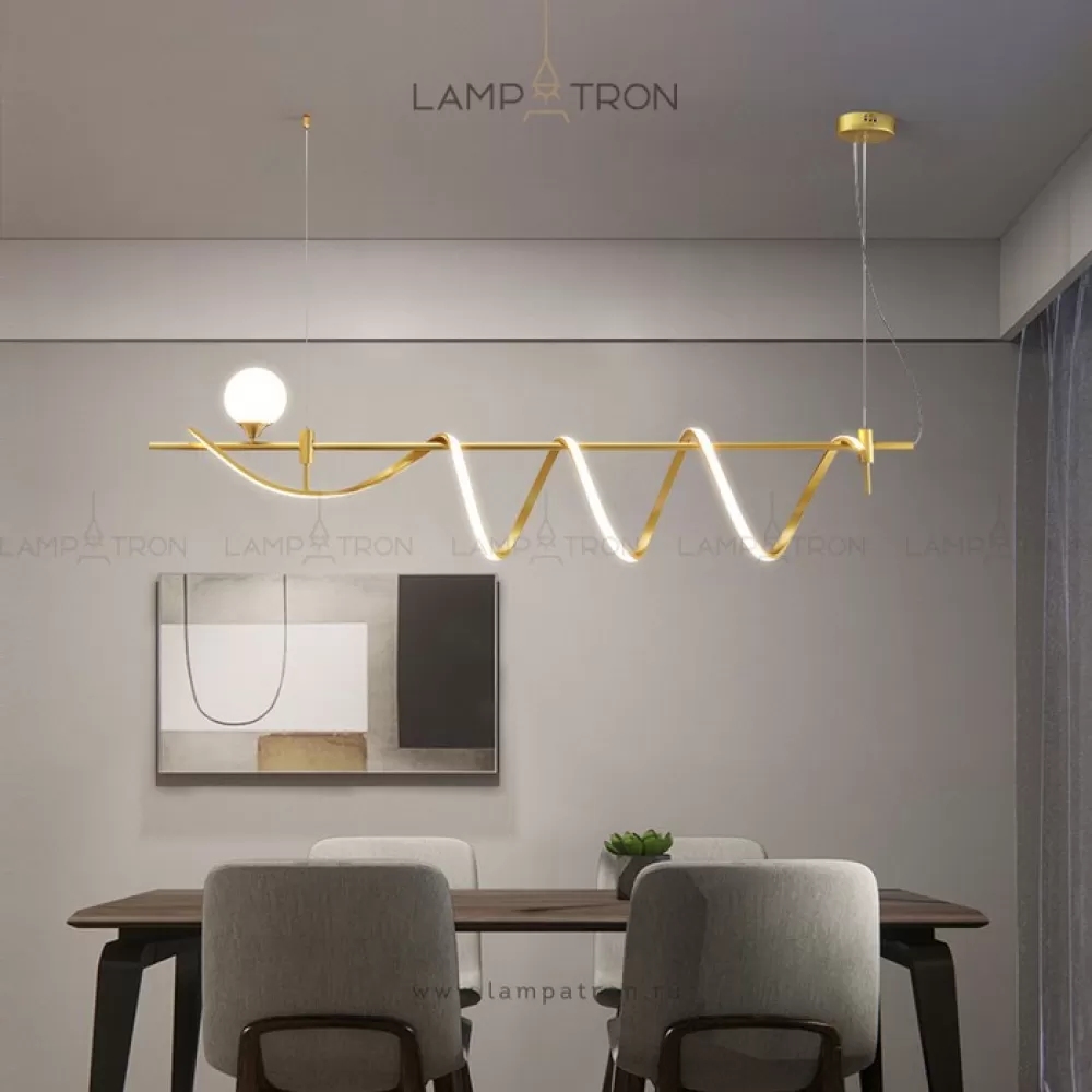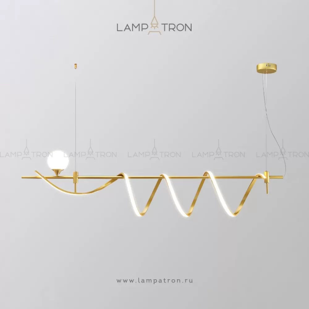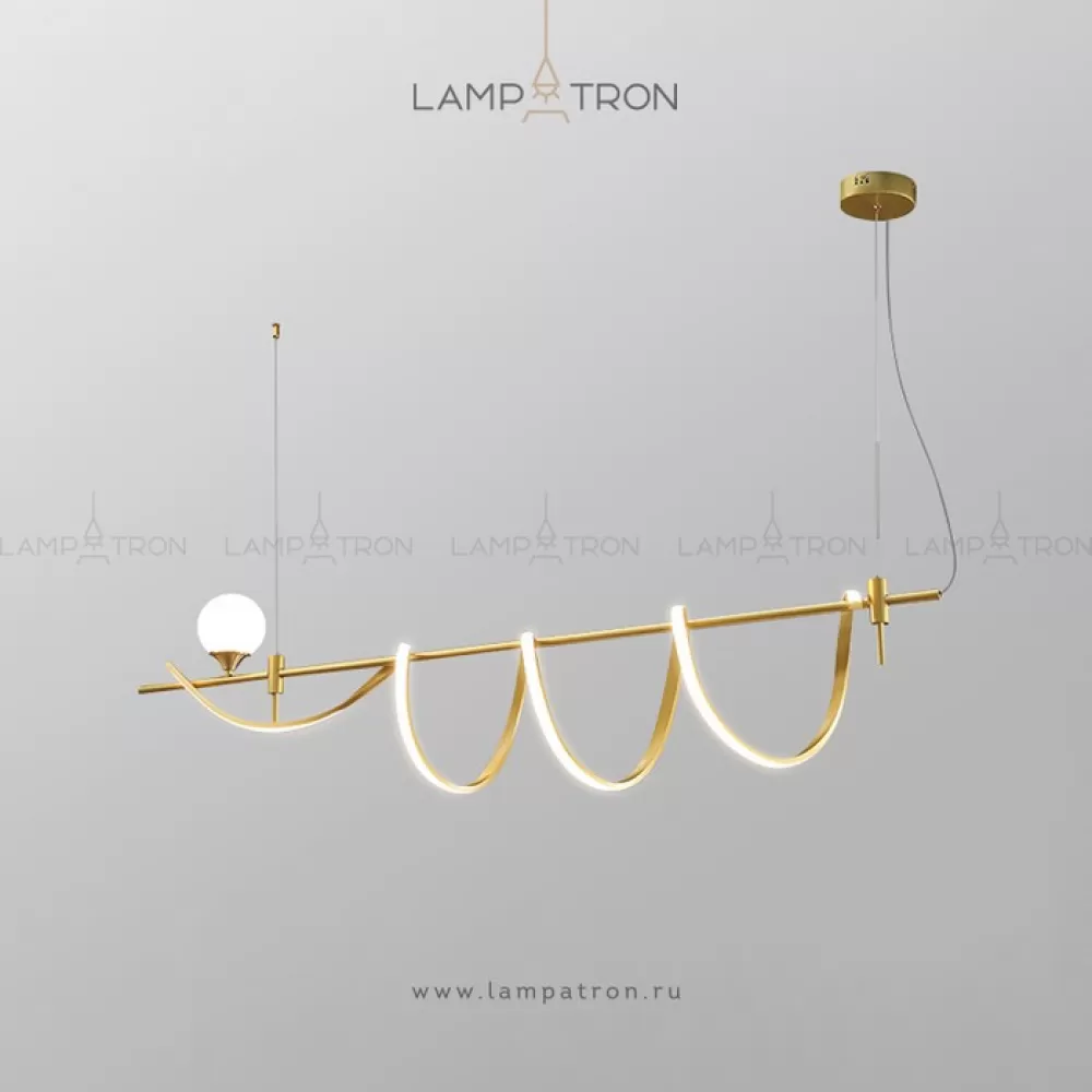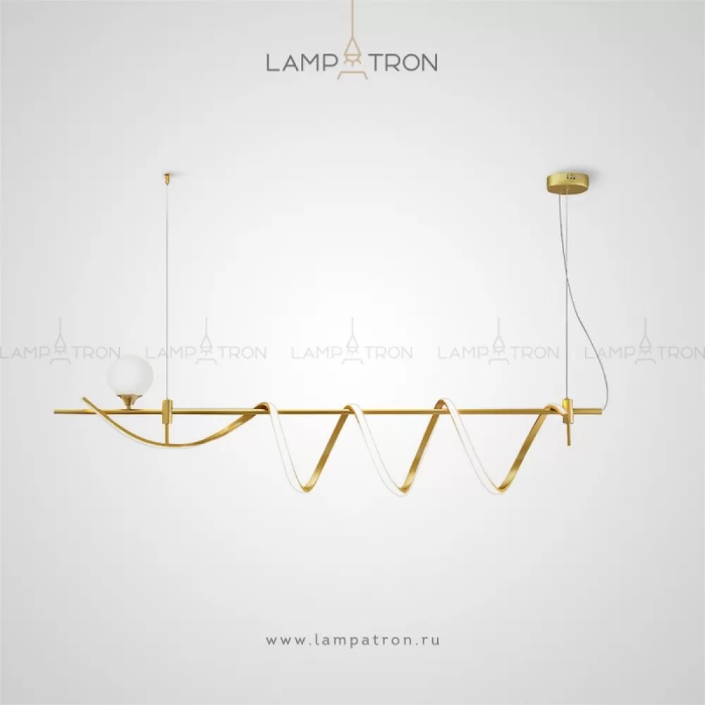 COURT01. Реечный. Материал: металл/силикон; цвет корпуса: латунь; размеры (ширина × высота): 150 × 35 см; длина подвеса: 100 см; тип источника: LED матрица+G9; цветовая температура: теплый свет; количество источников: 2