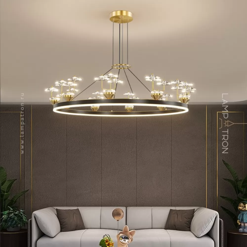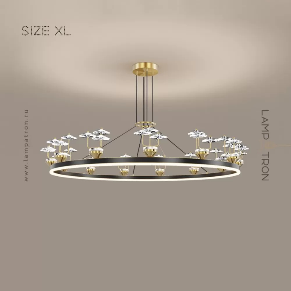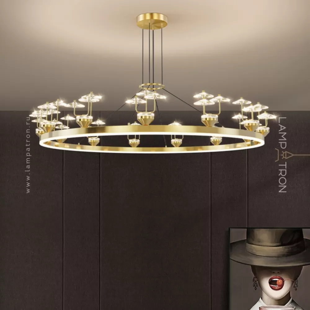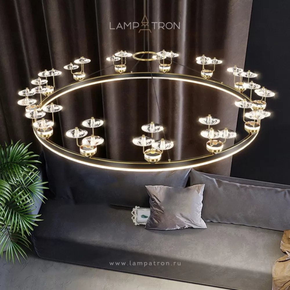 Серия кольцевых светодиодных люстр с хрустальными дисковидными рассеивателями в виде соцветий на конических стойках
