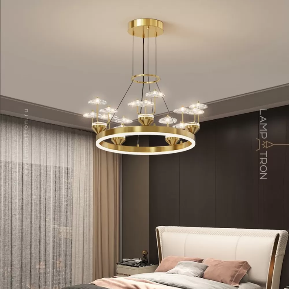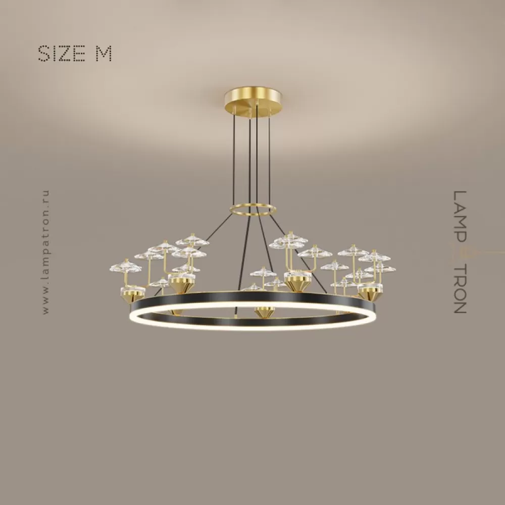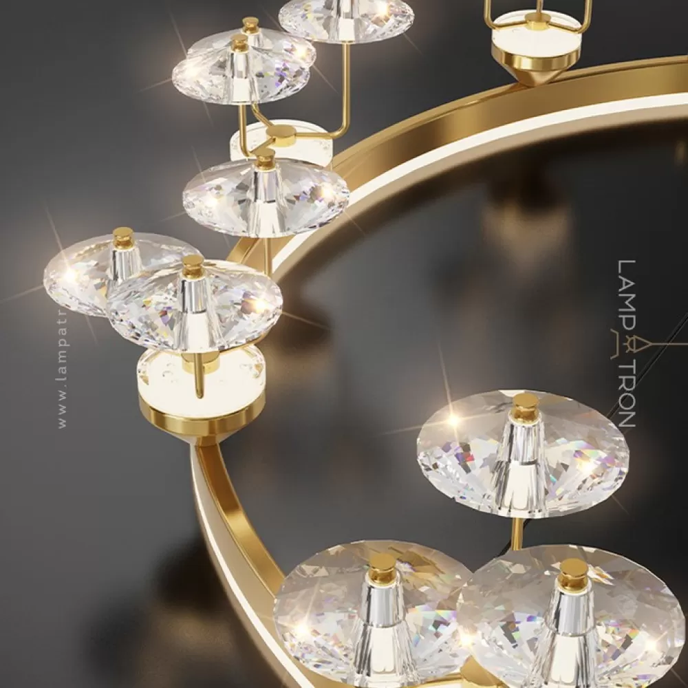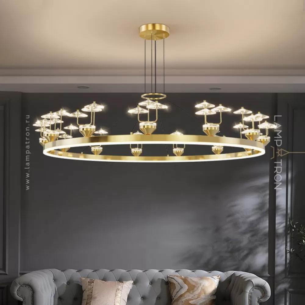 Серия кольцевых светодиодных люстр с хрустальными дисковидными рассеивателями в виде соцветий на конических стойках