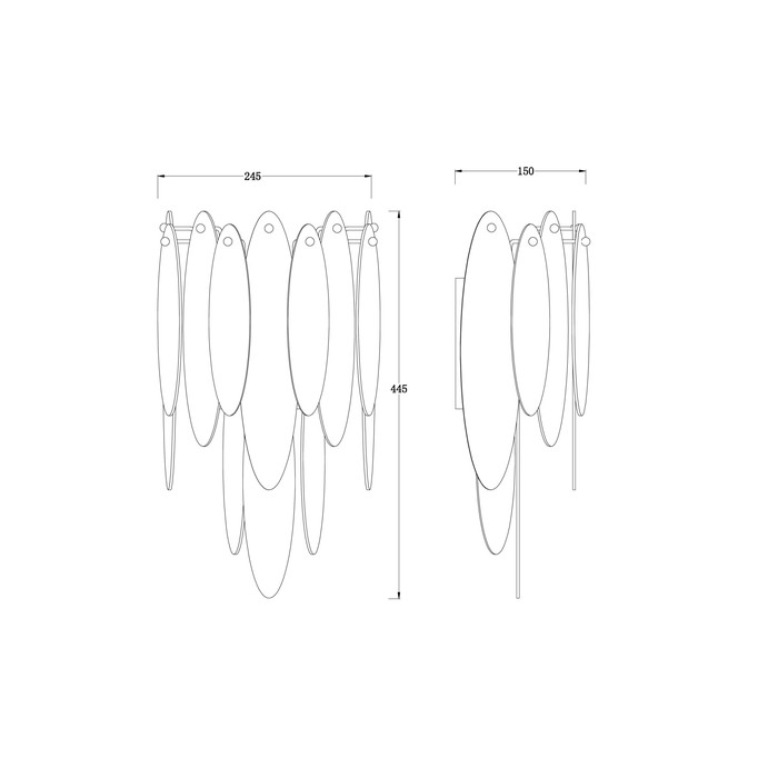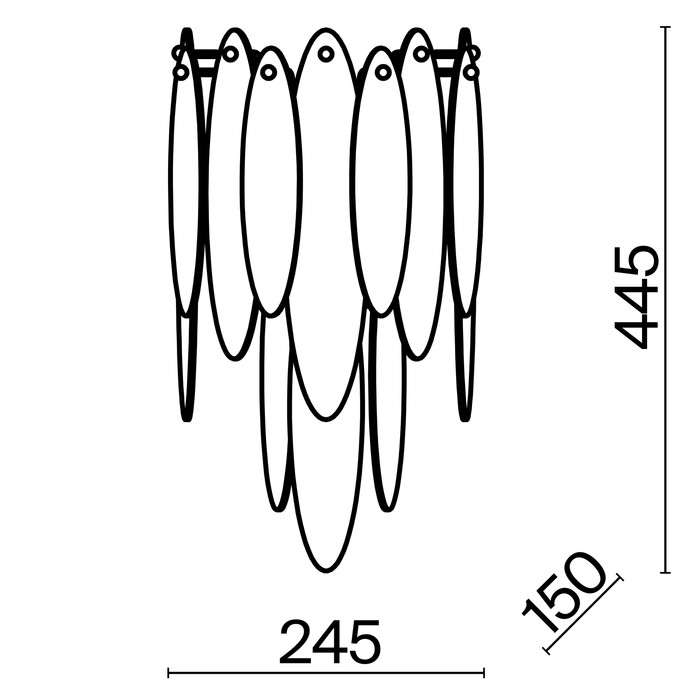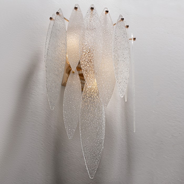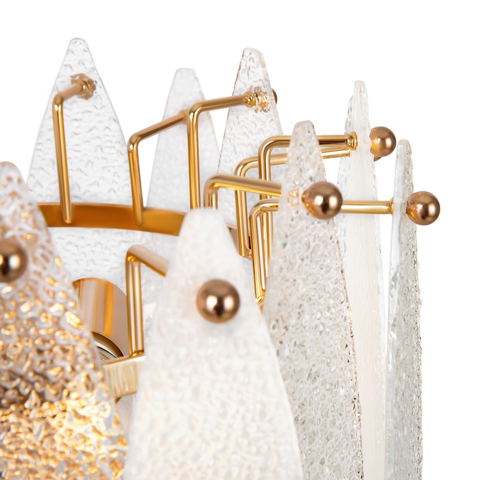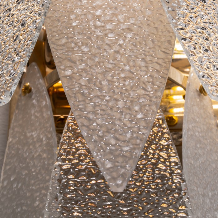 Металлическая арматура, цвет - французское золото. Декоративные элементы из прозрачного стекла в форме пестрых лепестков "замороженной" фактуры. Источник света - лампы с цоколем Е14 скрыты за декоративными подвесками на металлической окружности. Высота подвесов регулируется.
