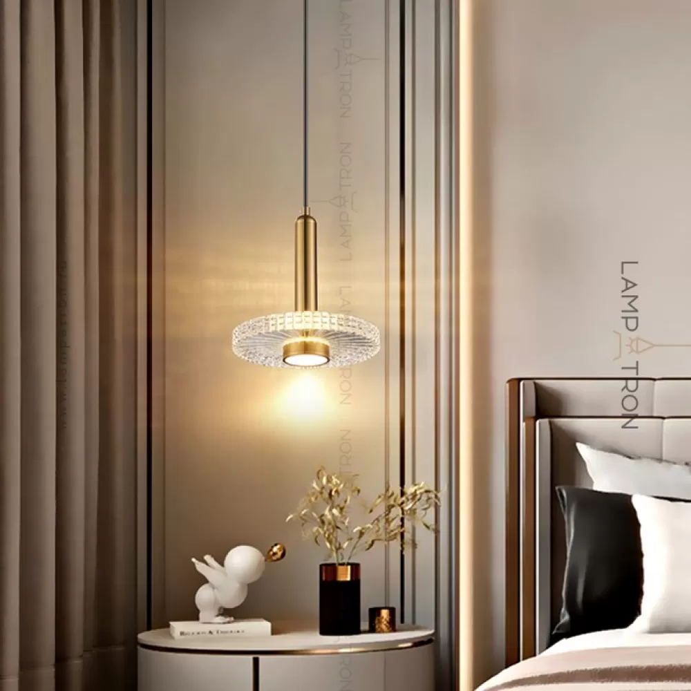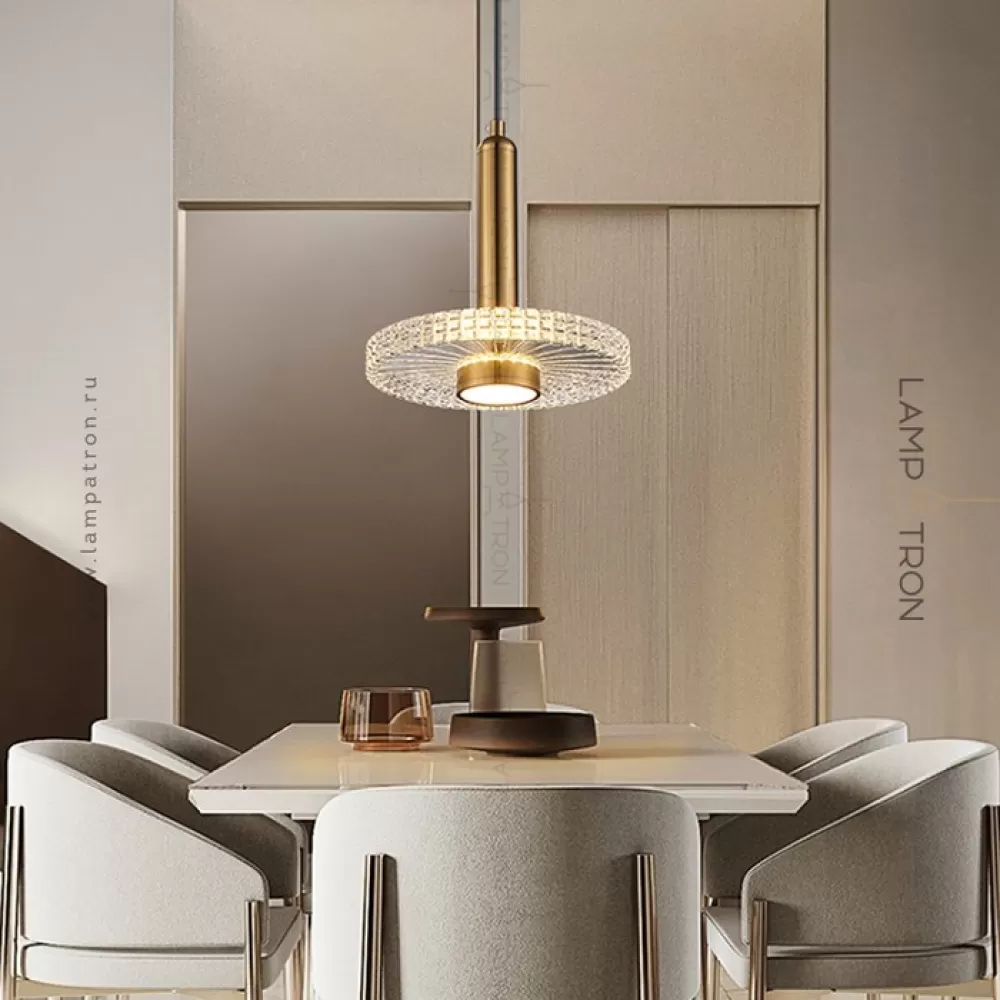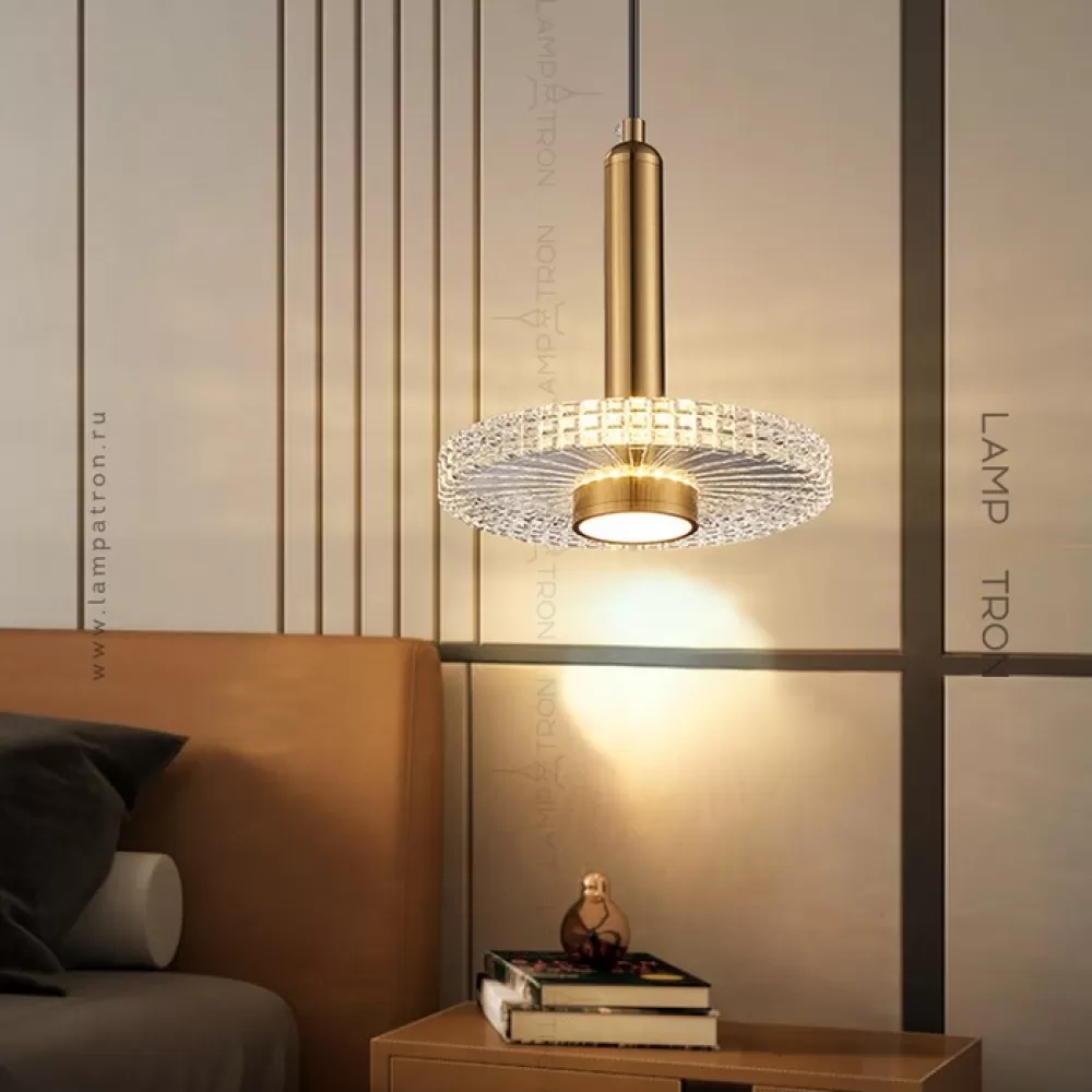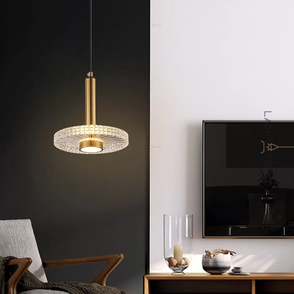 GEORGA01. Подвес. Материал: металл/акрил; цвет корпуса: латунь; размеры (диаметр × высота): Ø 16 × 22 см; длина подвеса: 150 см; тип источника: LED матрица; цветовая температура: теплый свет; количество источников: 1