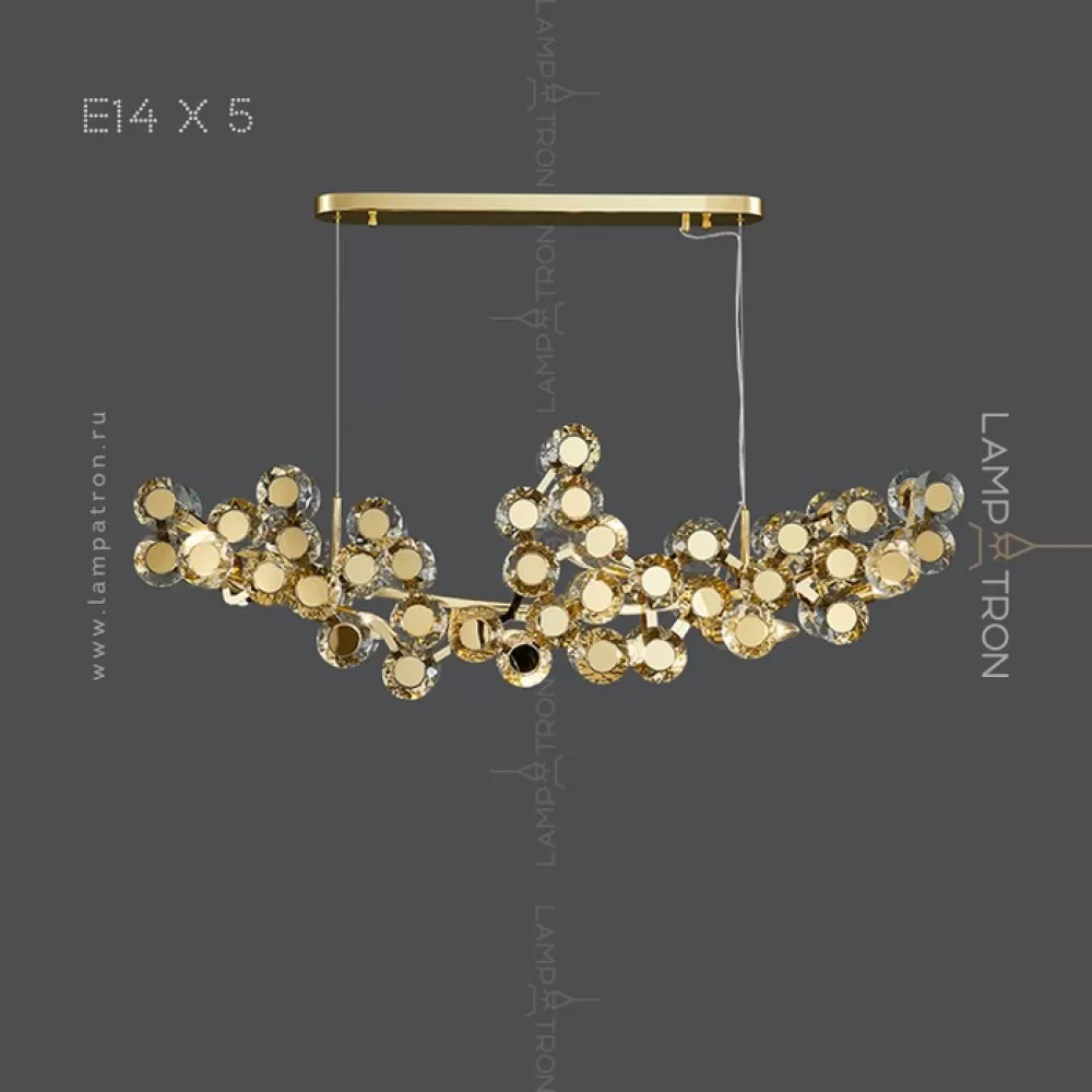 IOLA-L01. Реечный. Материал: металл/хрусталь; цвет корпуса: латунь; размеры (ширина × высота): 96 × 38 см; тип цоколя: E14; количество источников: 5