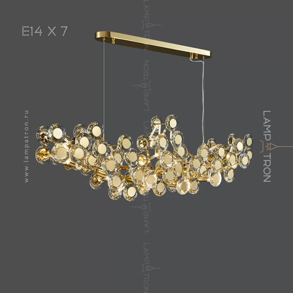 Серия реечных светильников с рассеивателями в виде хрустальных медальонов с латунной сердцевиной на ветвистом каркасе