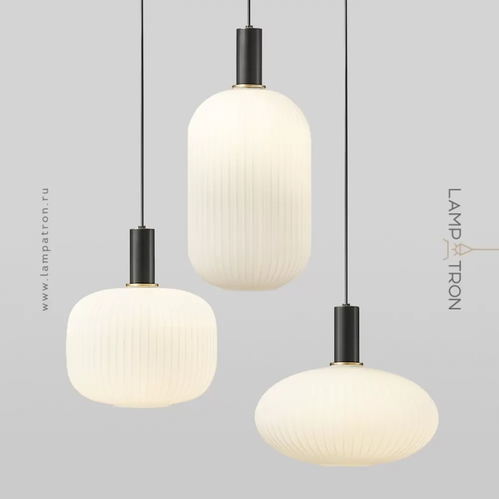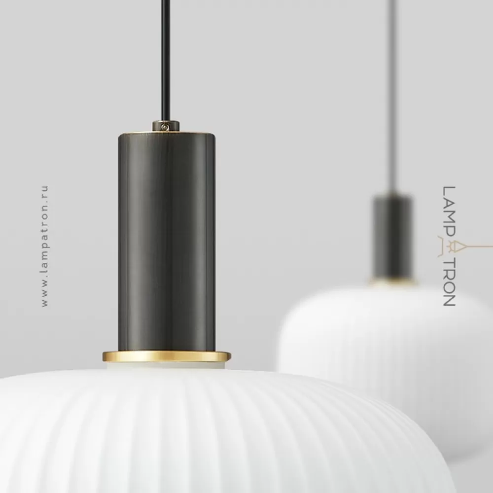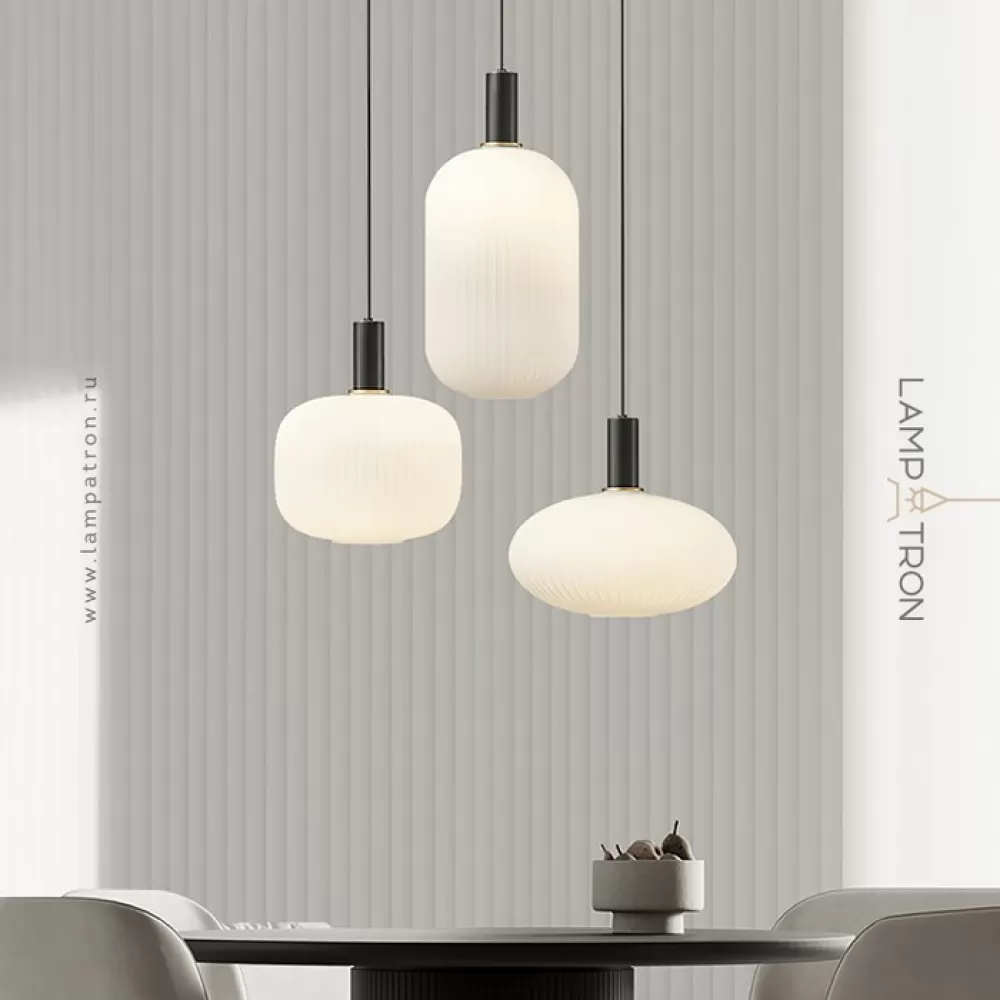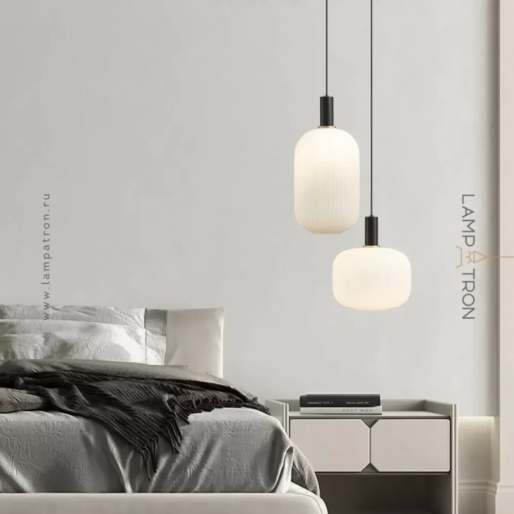 Серия подвесных светильников с рельефными плафонами из белого и прозрачного стекла
