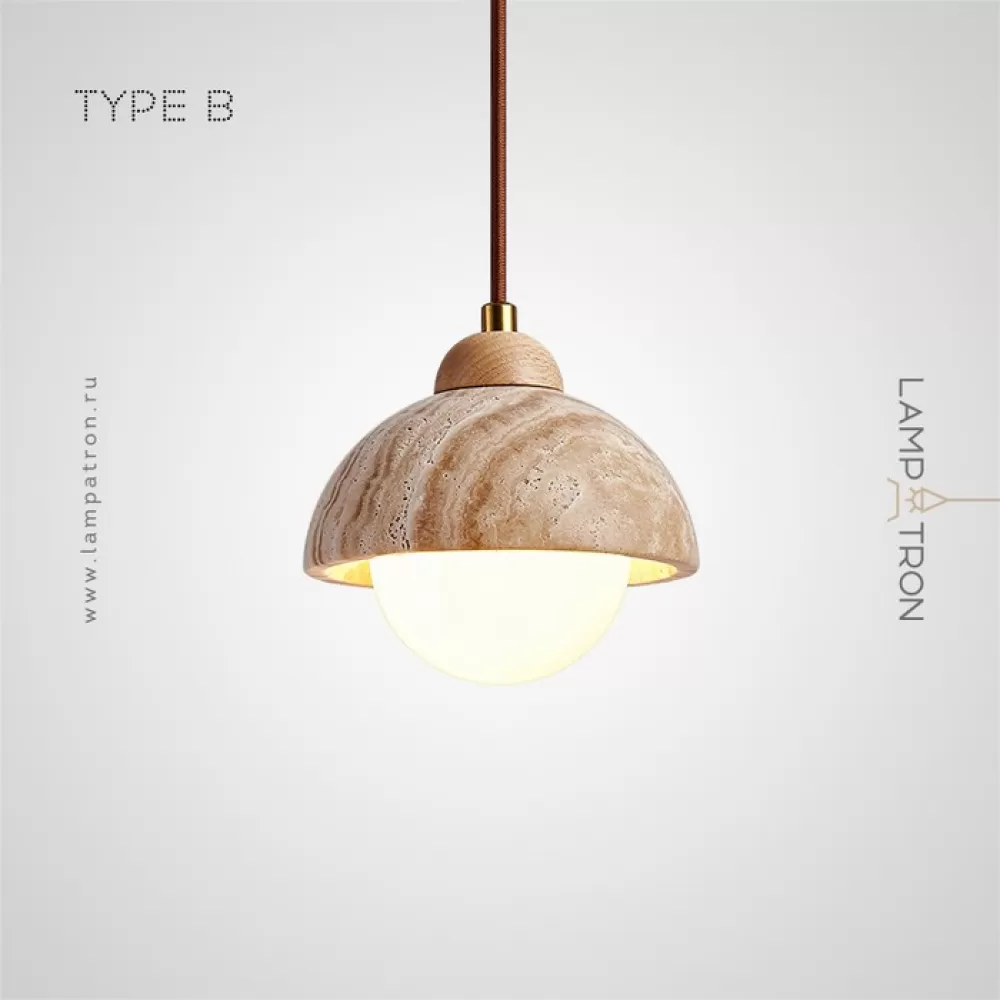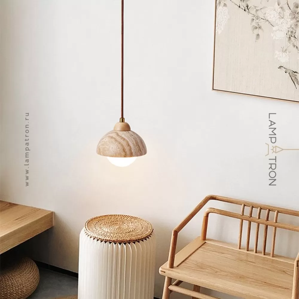 JAMTE01. Подвесной светильник. Материал: металл/камень травертин/дерево/стекло; цвет корпуса: песочный; размеры (диаметр × высота): Ø 15 × 18 см; потолочное крепление: Ø 10 × 2,5 см; длина подвеса: 170 см; тип цоколя: E27; количество источников: 1