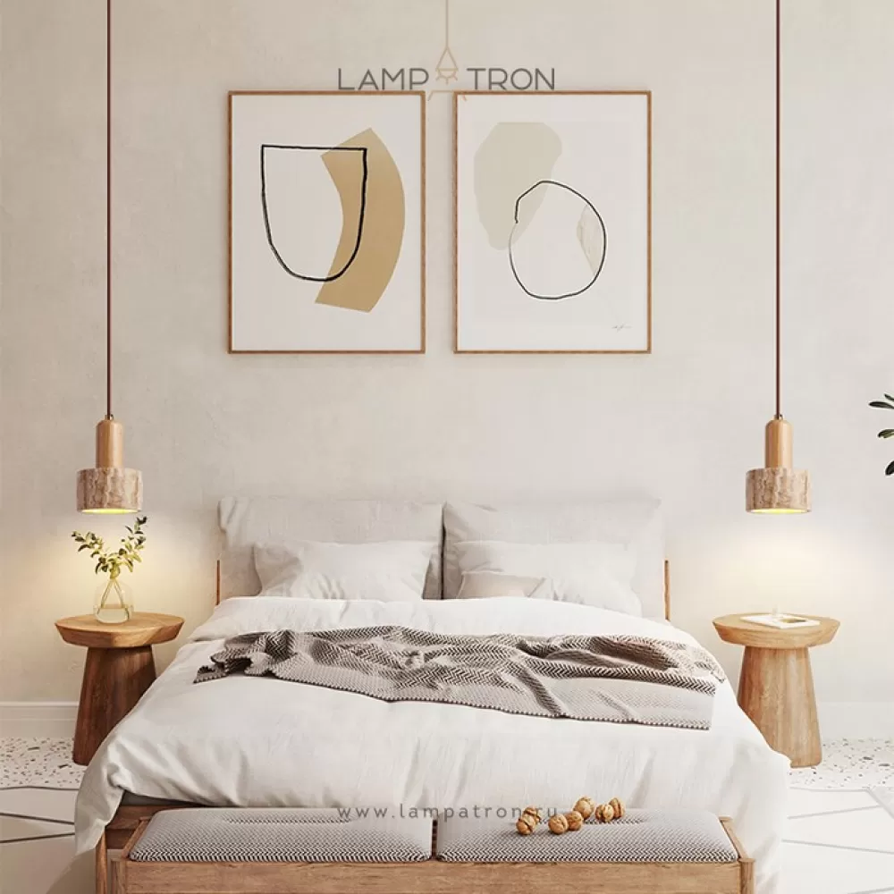 Серия подвесных светильников с цилиндрическим и купольным абажуром из камня травертина с деревянным цокалем