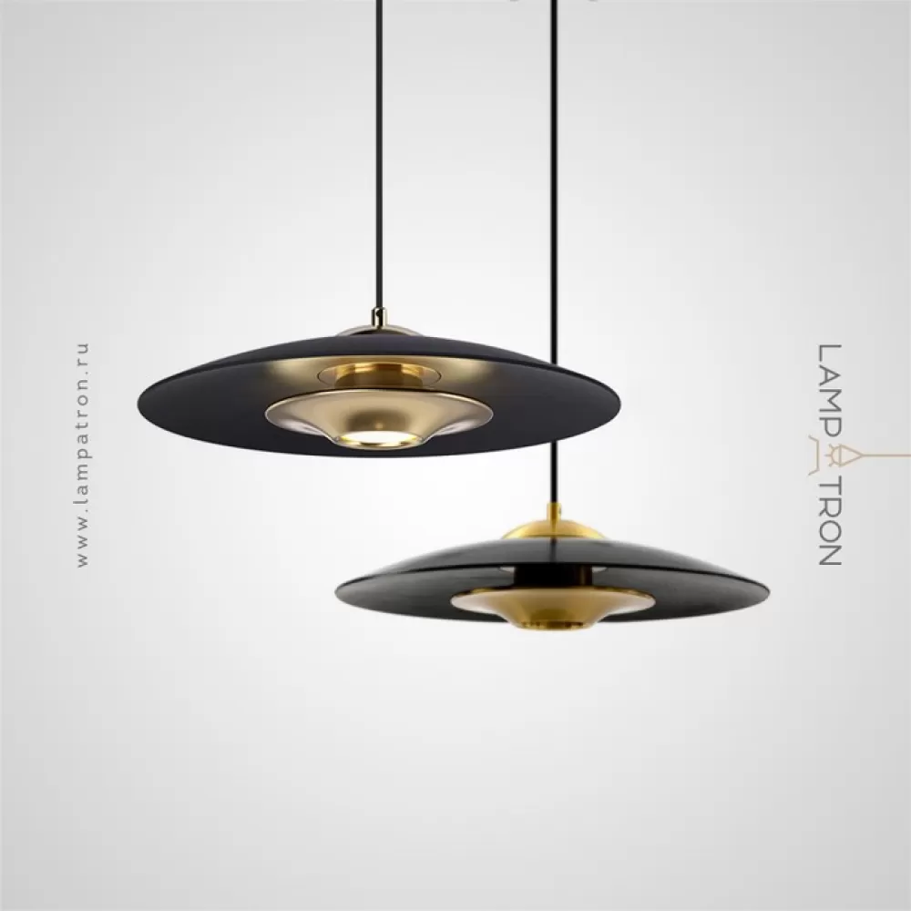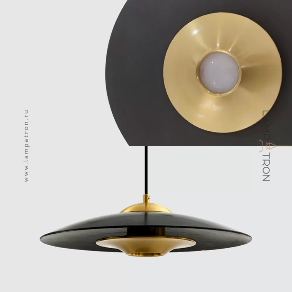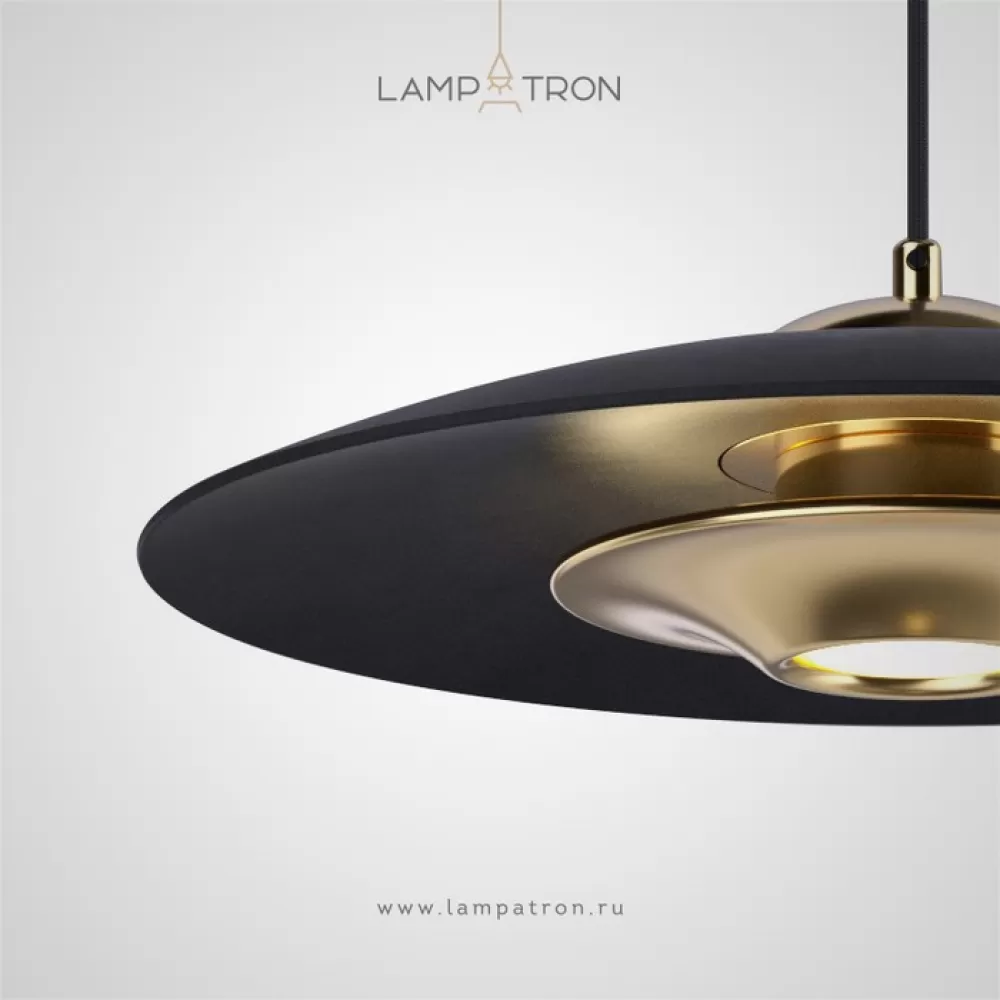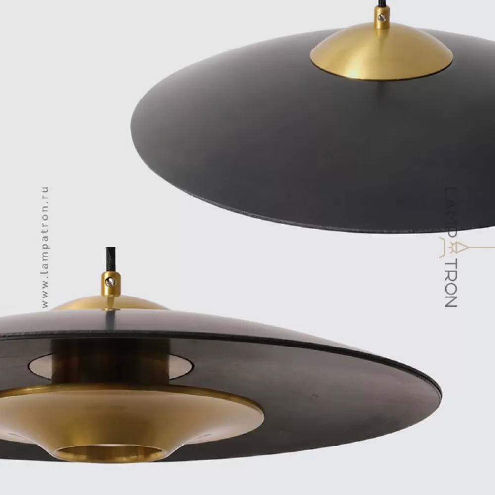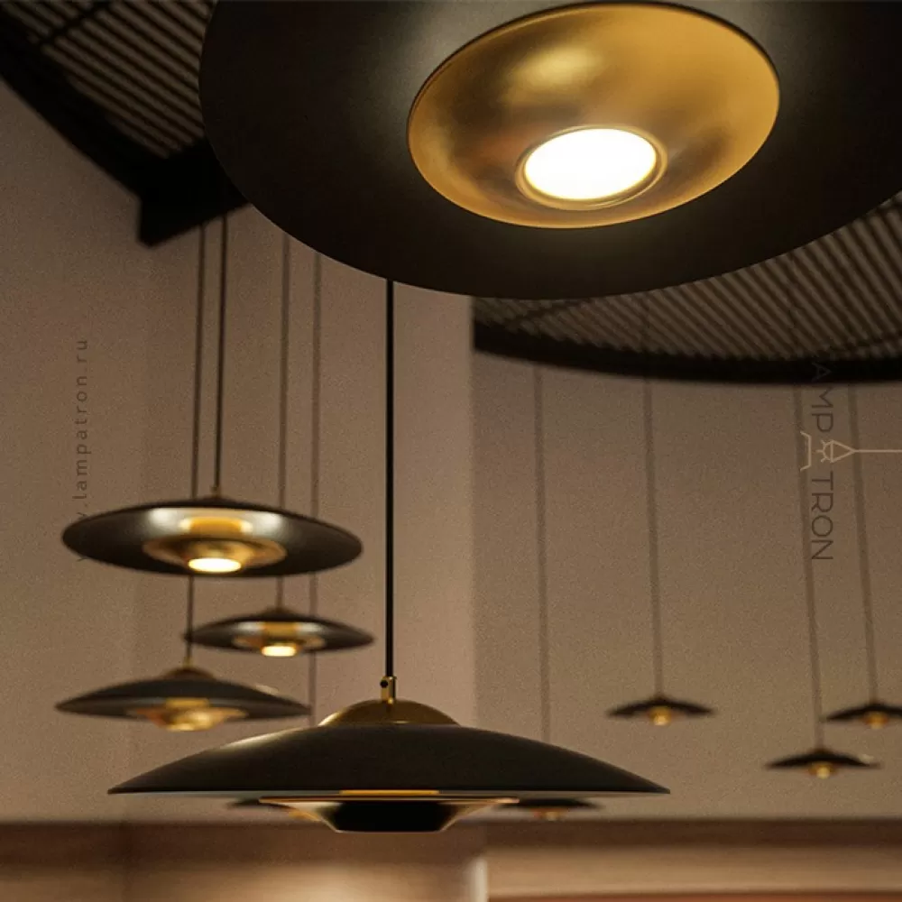 Подвесной светодиодный светильник с точечным источником в сборном корпусе из черных и латунных дисков