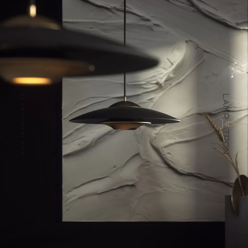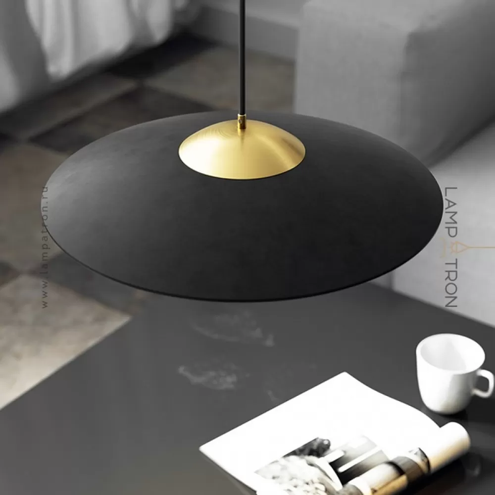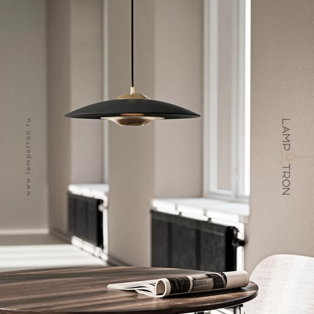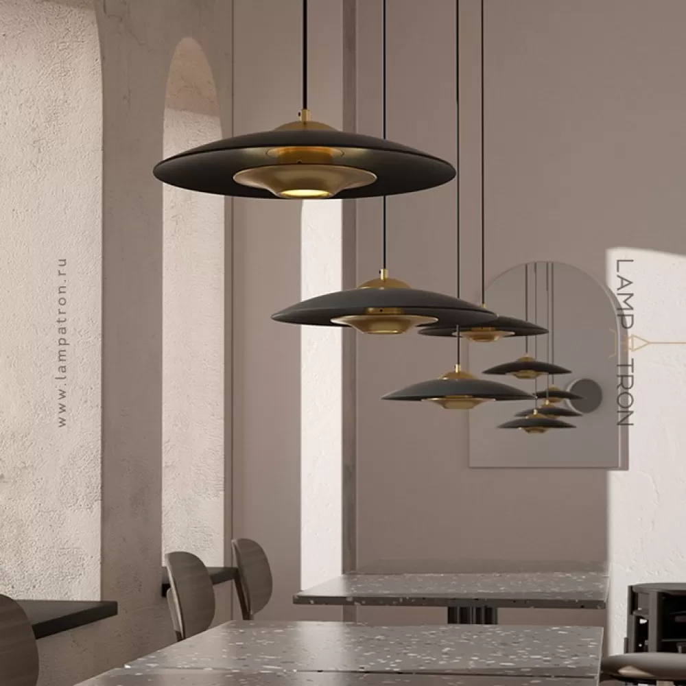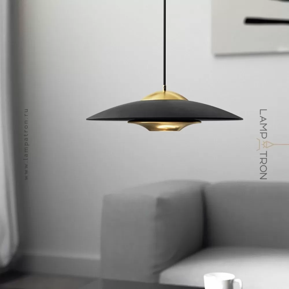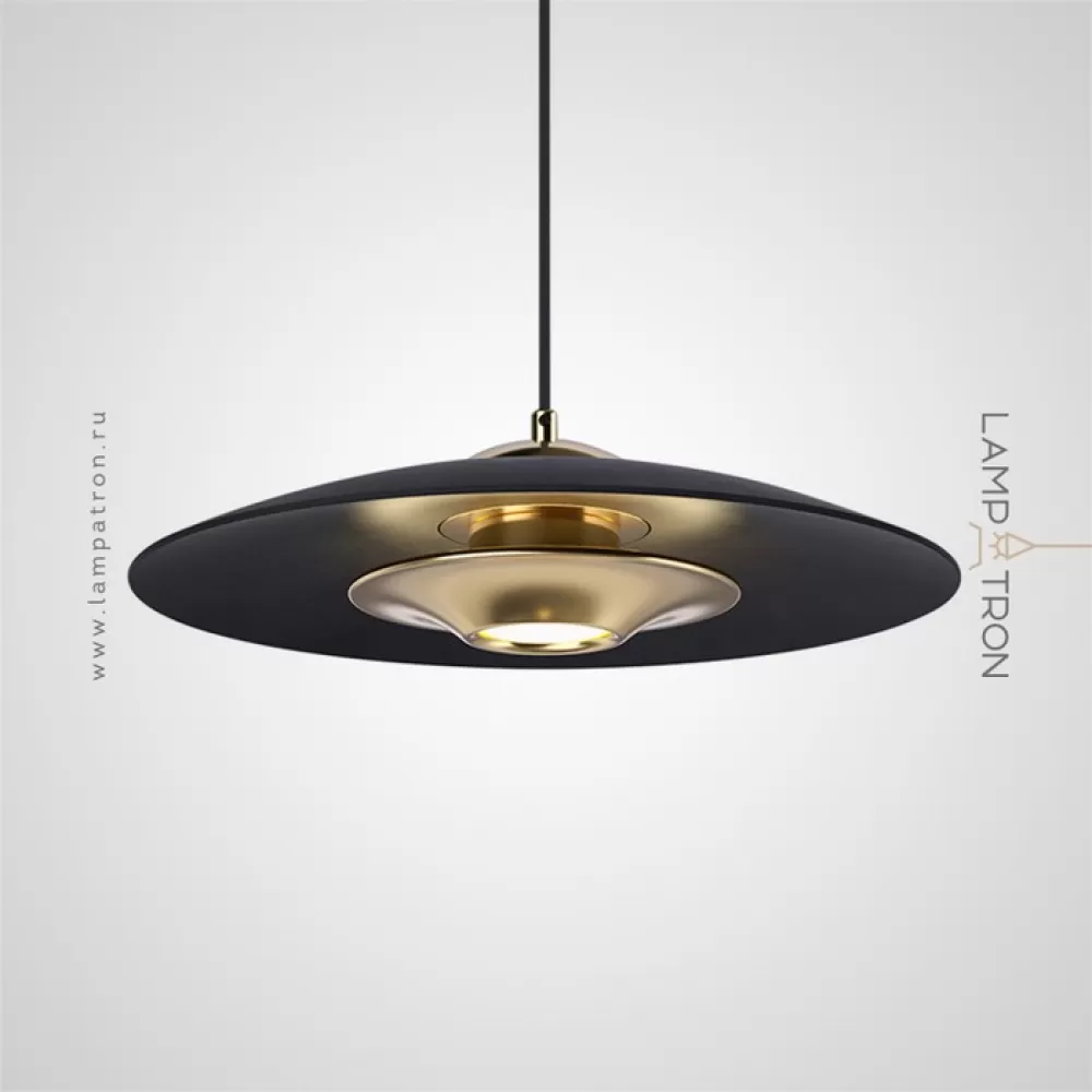Подвесной светодиодный светильник с точечным источником в сборном корпусе из черных и латунных дисков