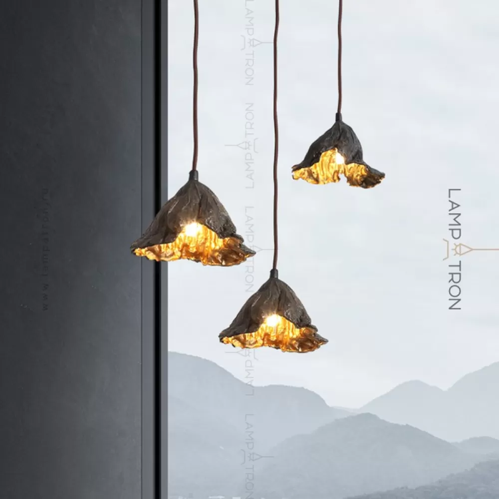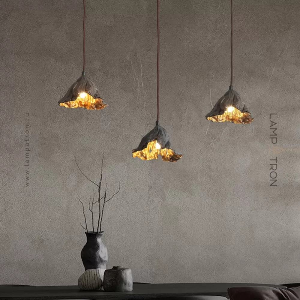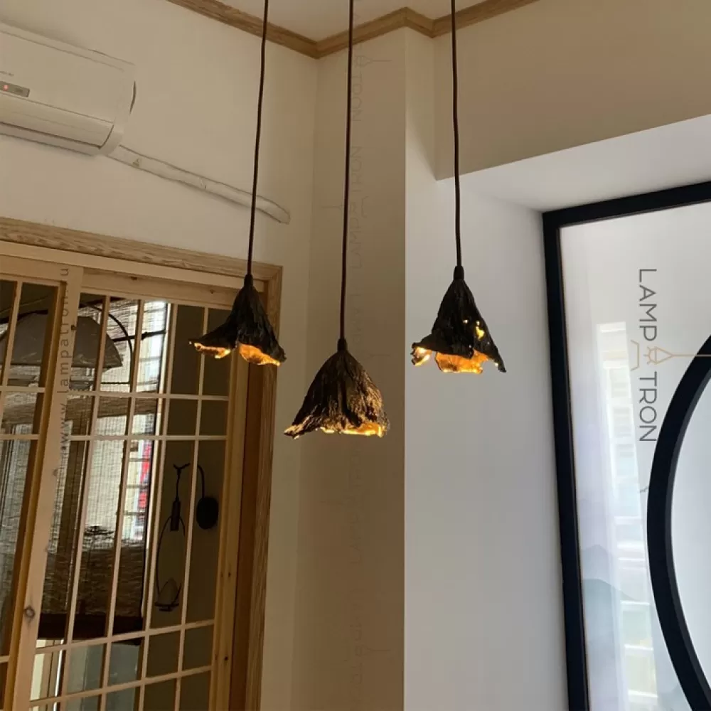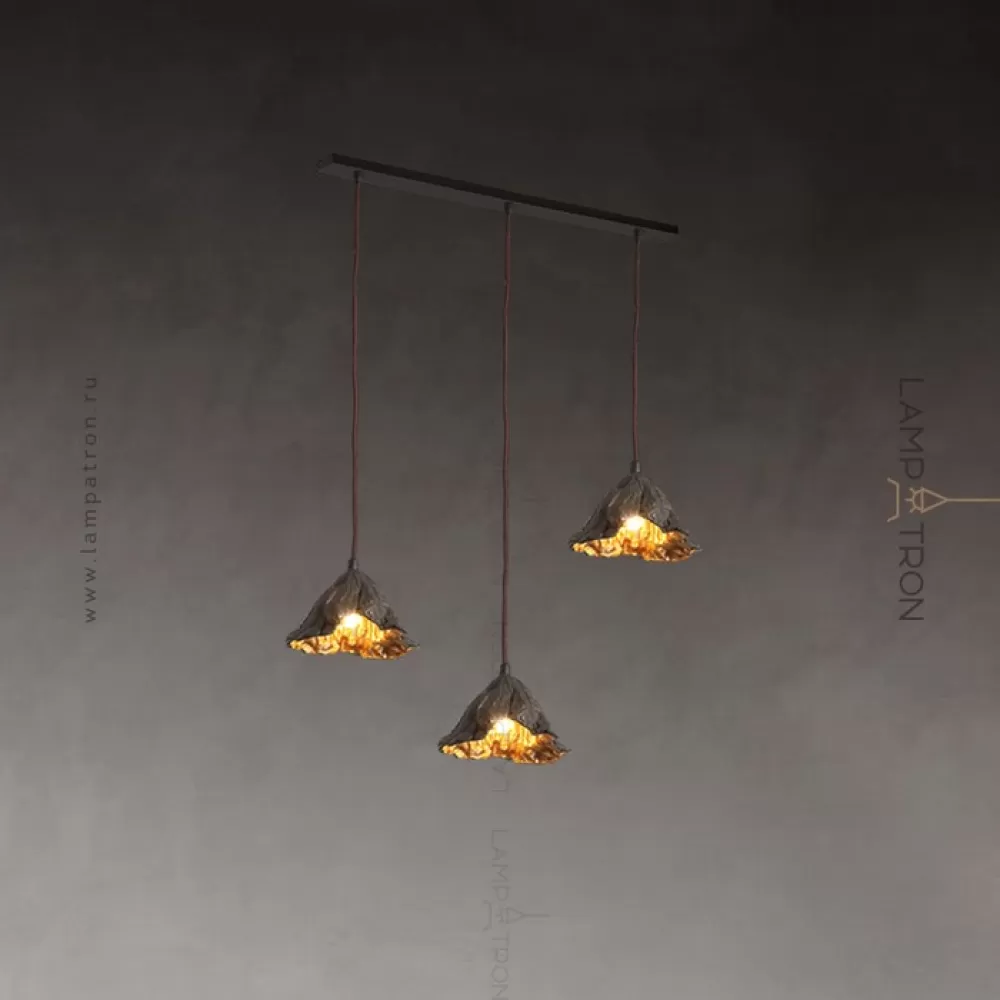 Готовая комбинация подвесных светильников с тремя плафонами в виде высушенных цветов с внутренней отделкой под золото