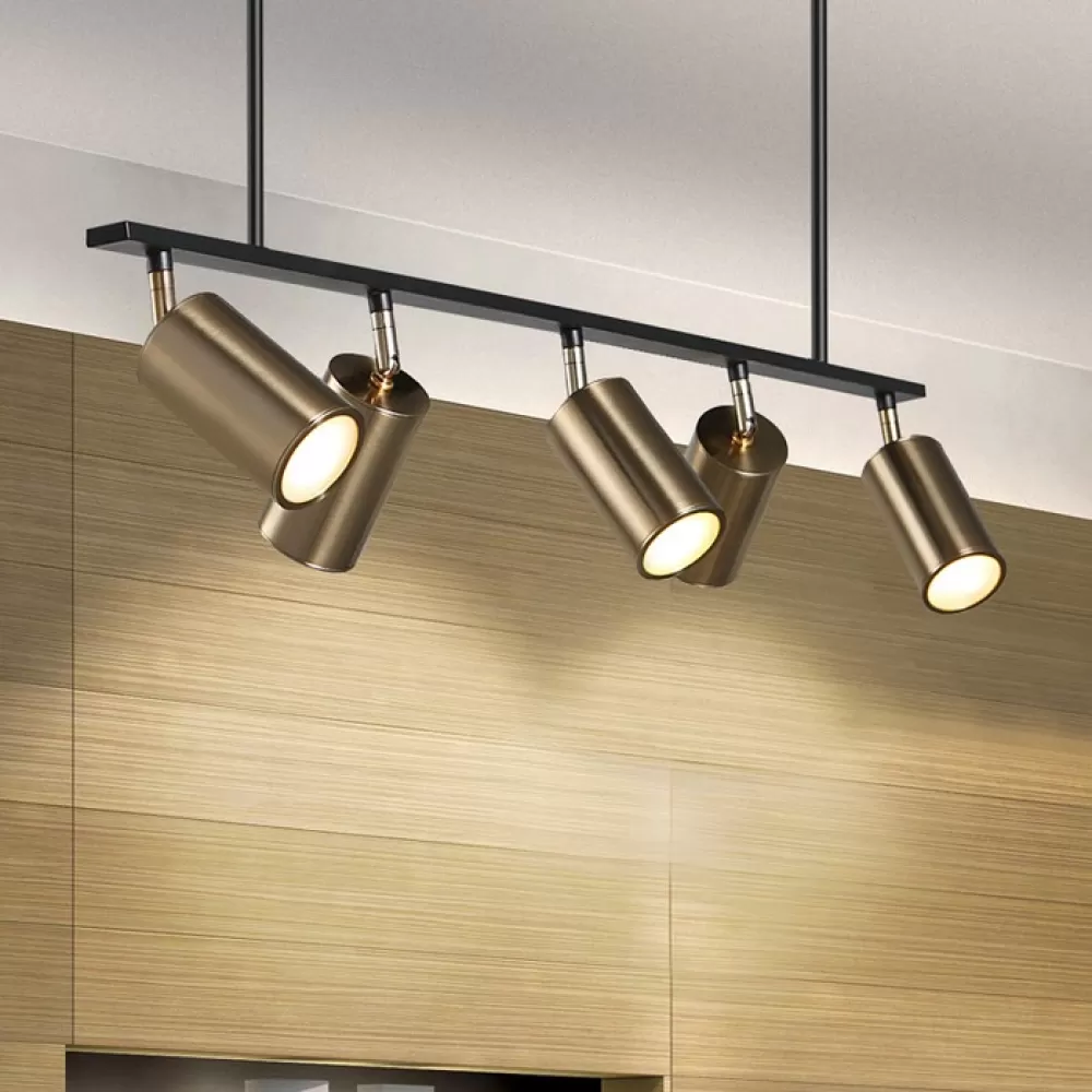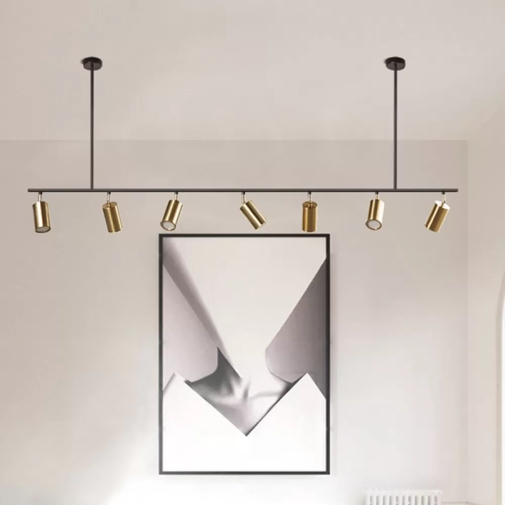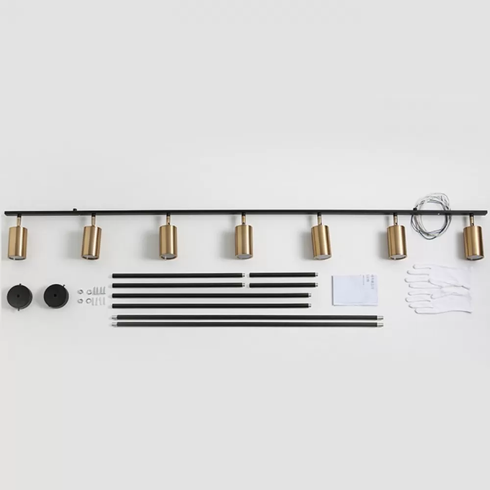 LINO01. Реечный светильник. Материал: металл; цвет: черный+латунь; размеры (длина × ширина): 165 × 15,5 см; высота сборной стойки: 200 см (с шагом 20 см); расстояние между стойками: 78 см; потолочное крепление (диаметр): Ø 8 см; тип цоколя: GU10; количество источников: 7