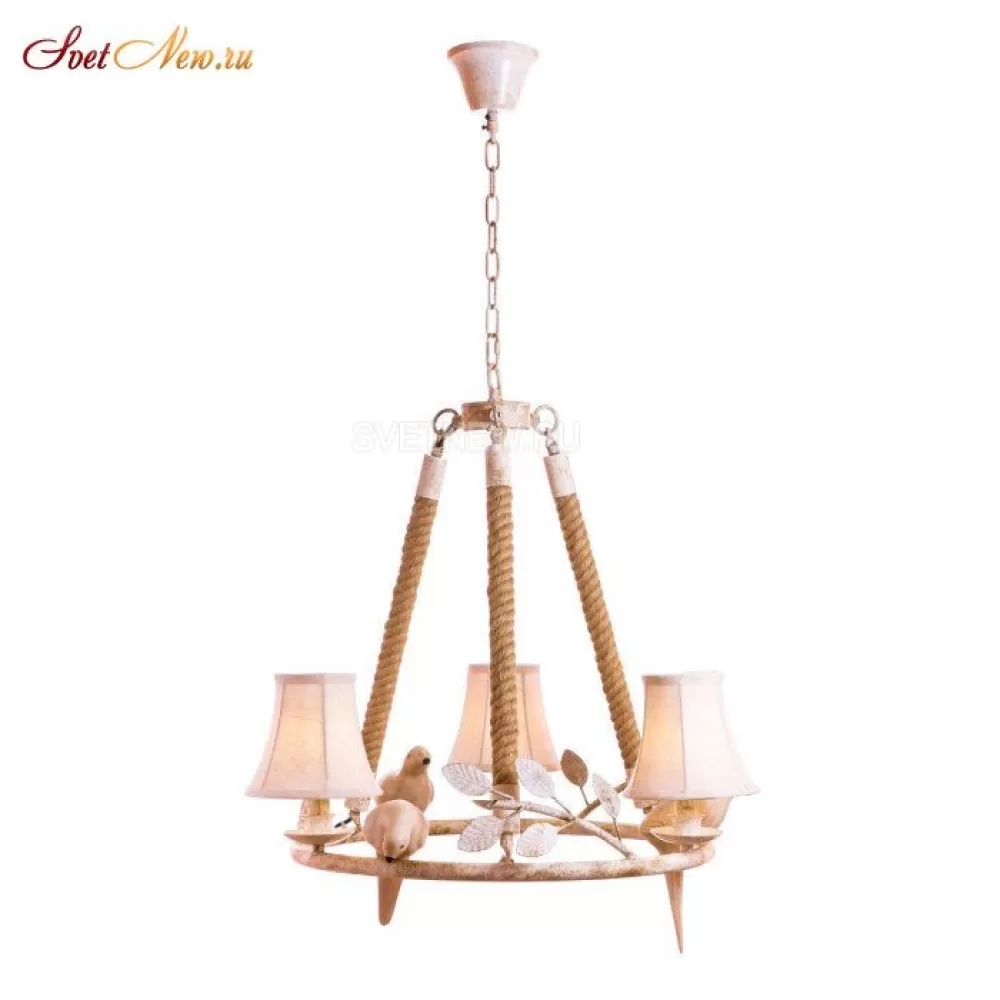 - Из чего сделан каркас , а также типовой цвет - каркас - металлпеньковый канат; плафон - текстиль; цвет основания - белый; цвет плафона - белый , можно узнать в перечне характеристик. Свет рассеивается с помощью абажура. Люстра выполнена в стиле классика.