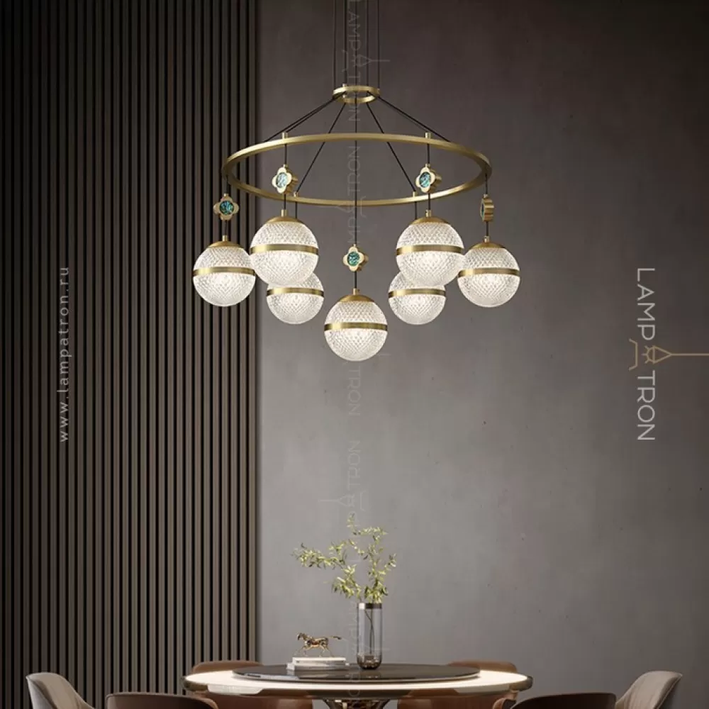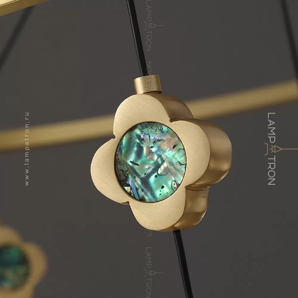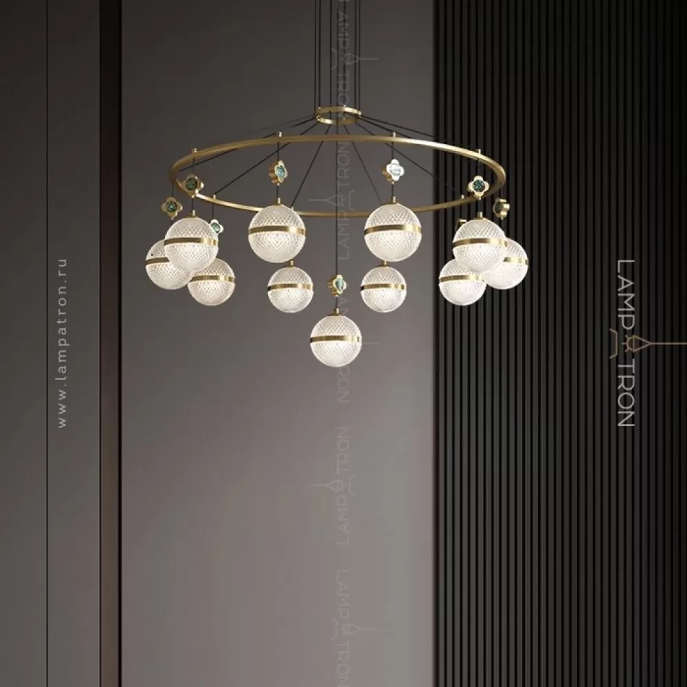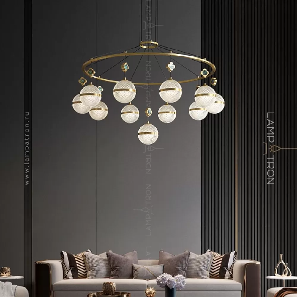 Серия кольцевых люстр с рельефными плафонами шарообразной формы на подвесах с перламутровыми цветами