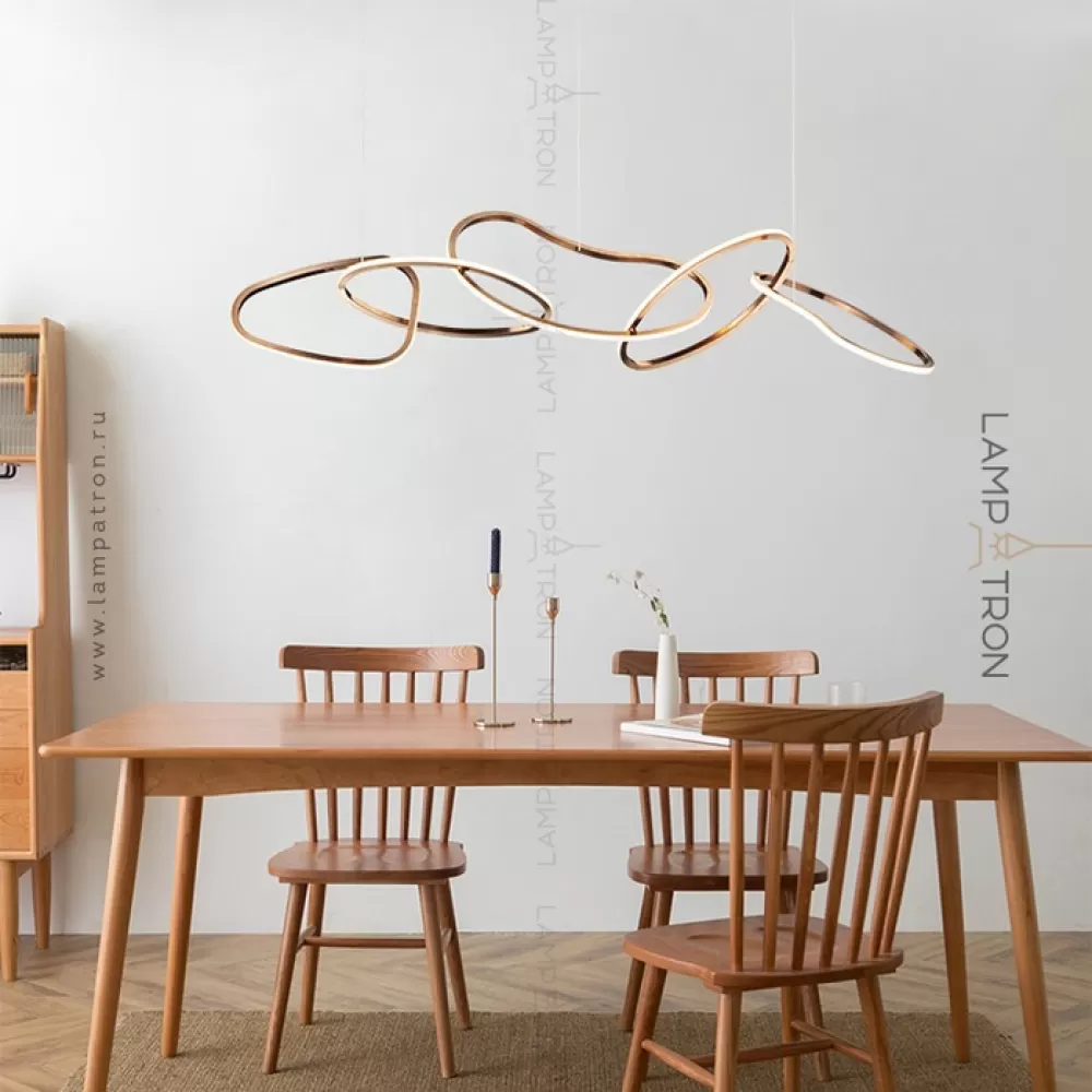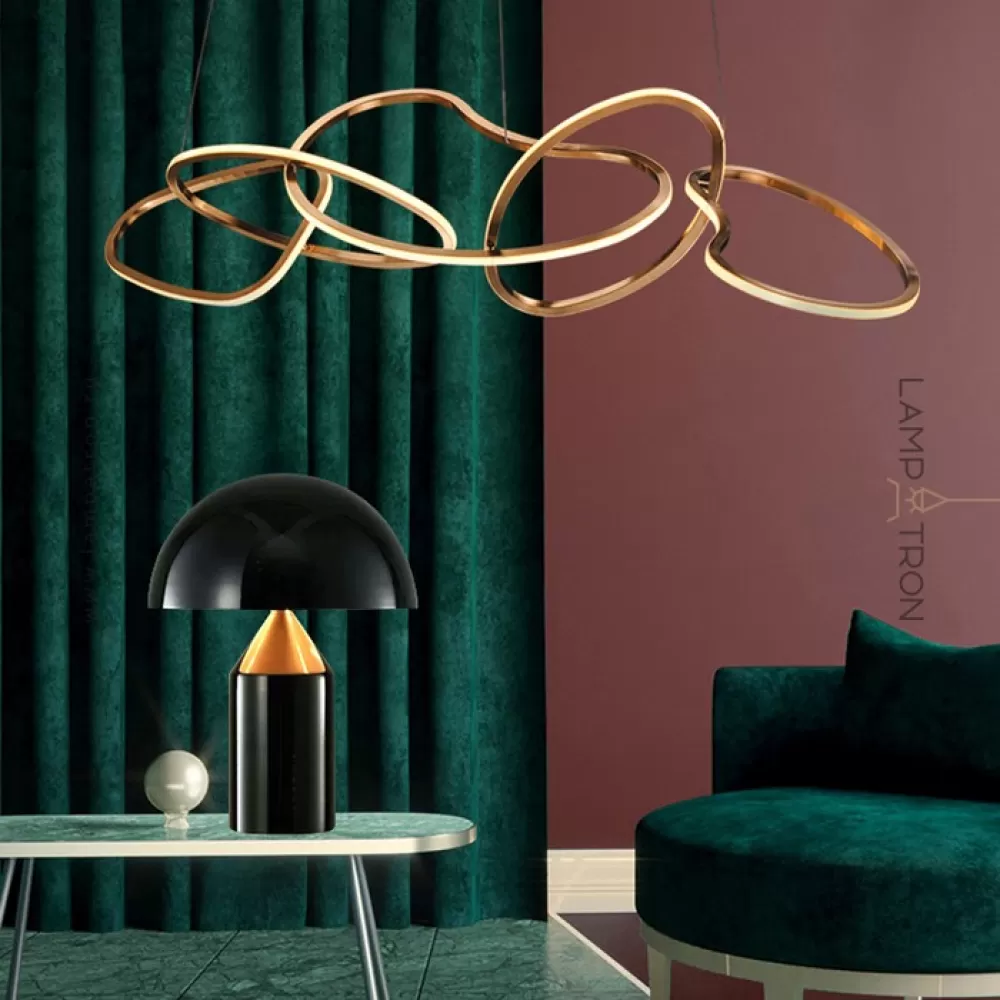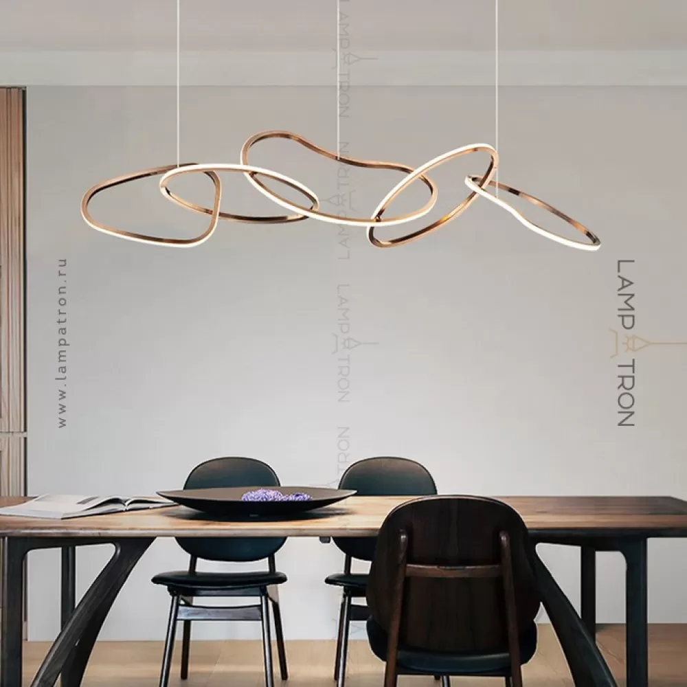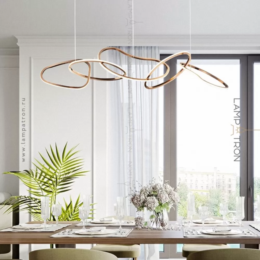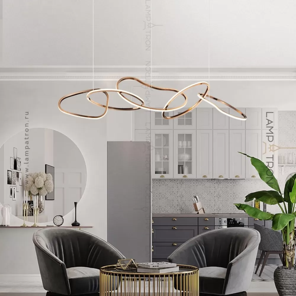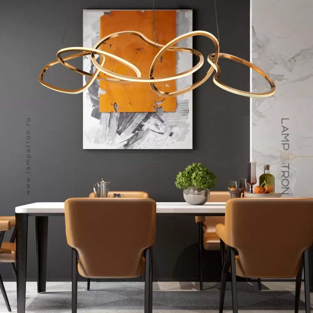 Светодиодная инсталляция в виде пересекающихся колец различной формы на струнном подвесе