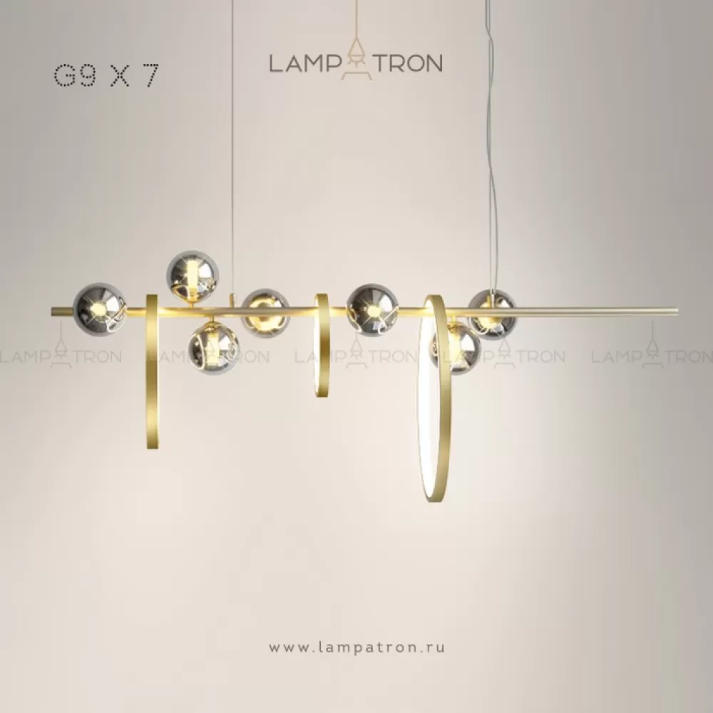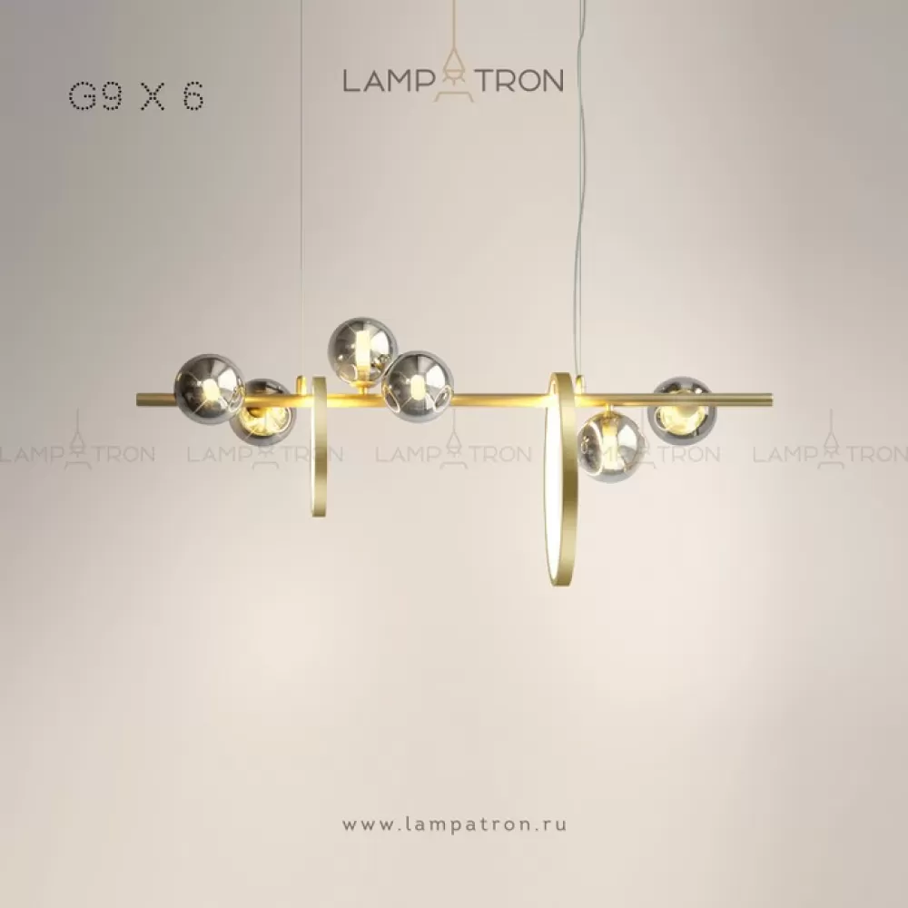 Серия реечных светильников с дымчатыми шарообразными плафонами из стекла, чередуемые кольцами разного диаметра с внутренней LED-подсветкой