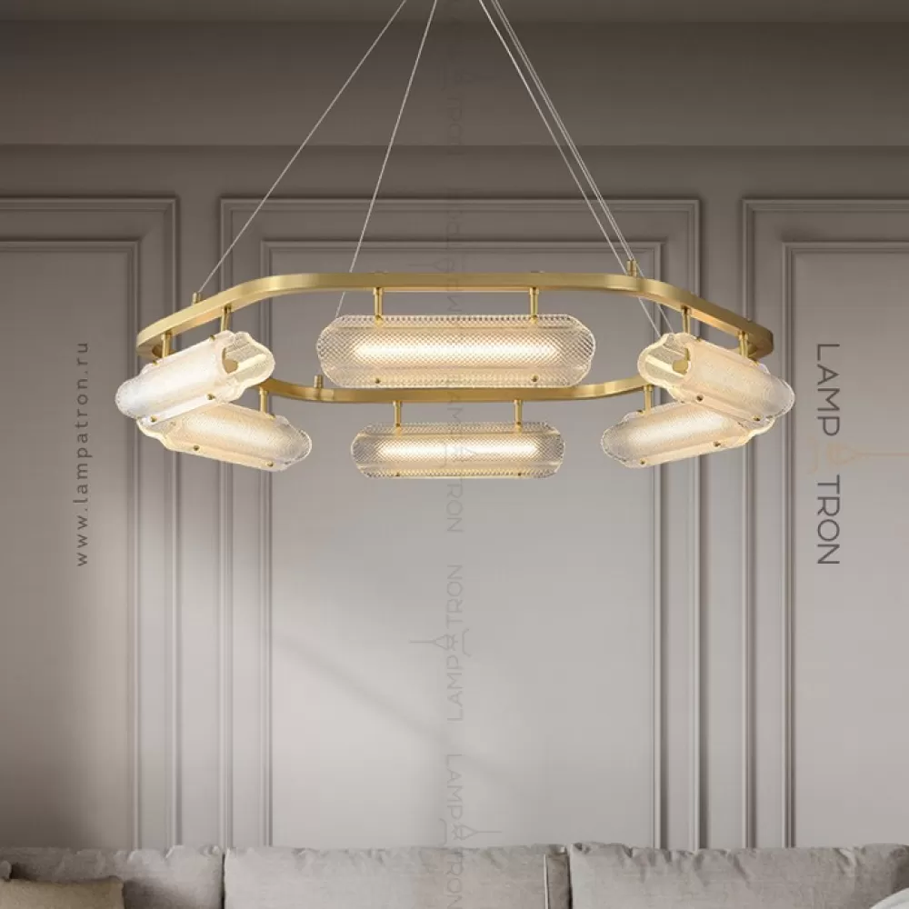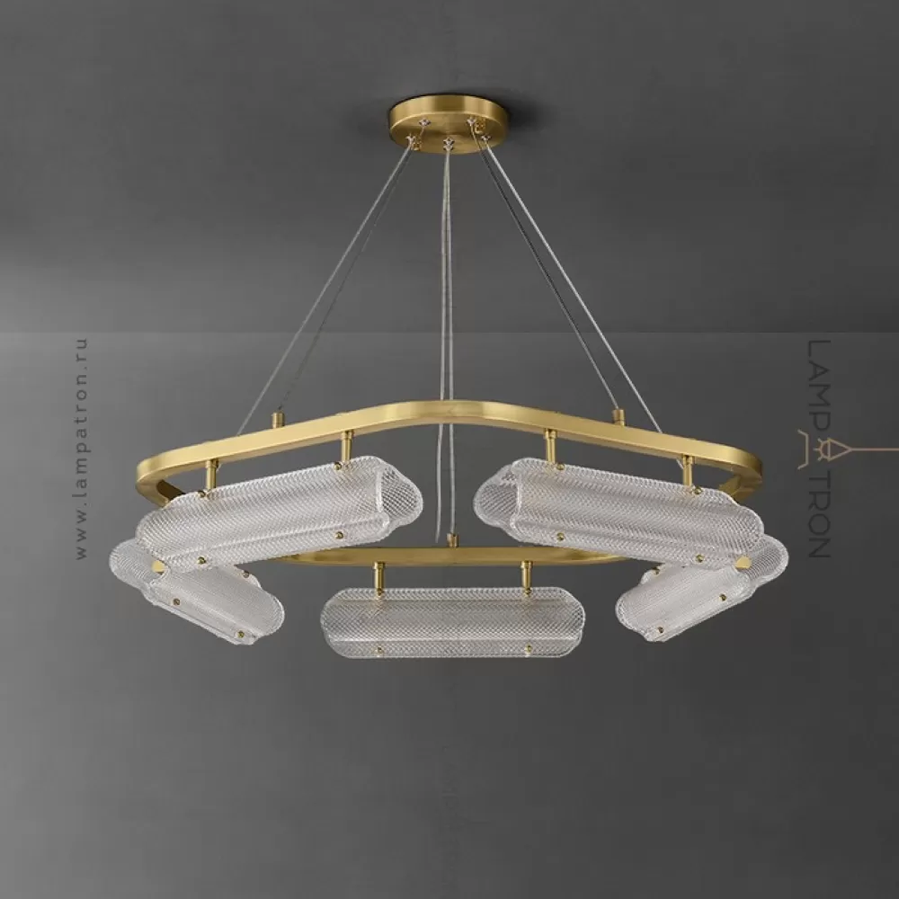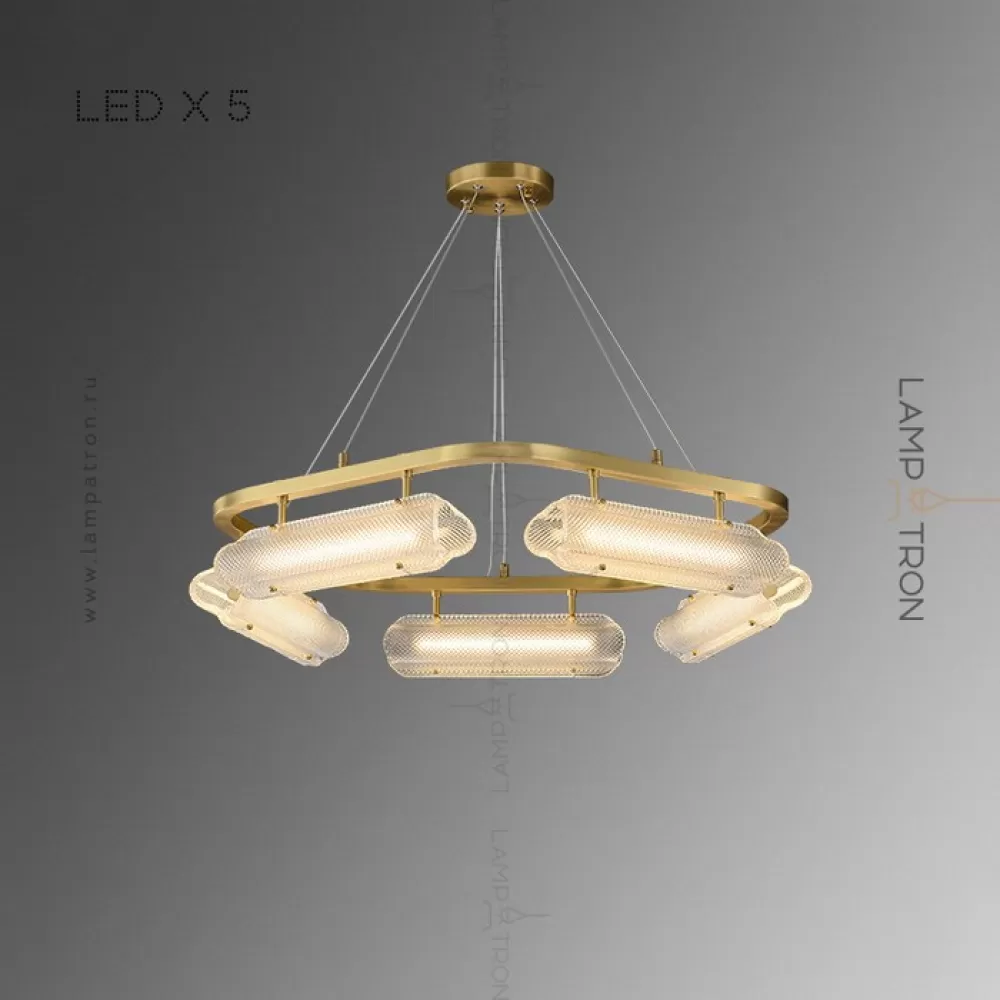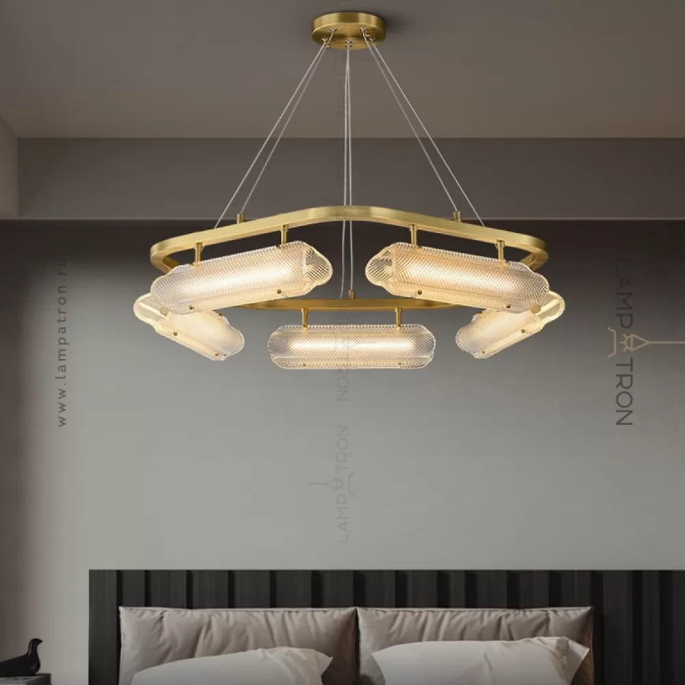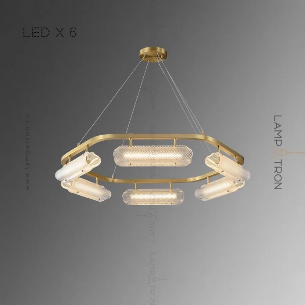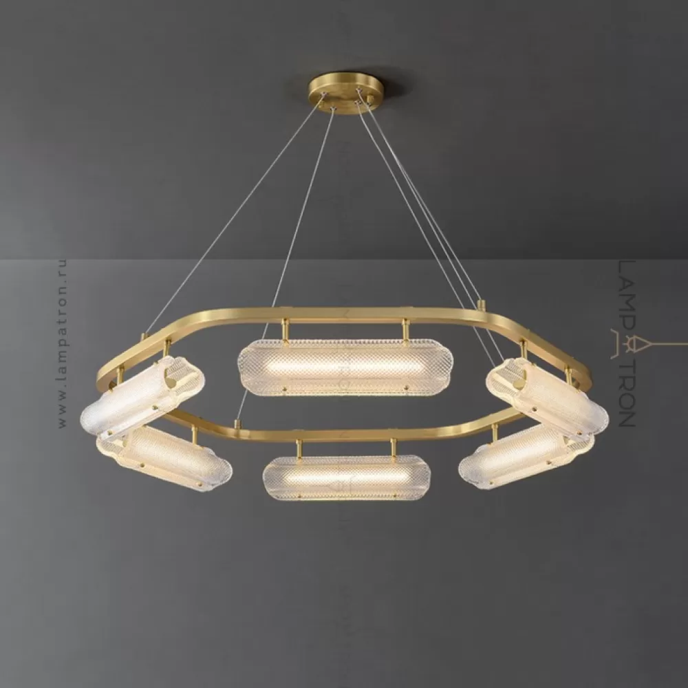 Серия светодиодных люстр с цилиндрическими плафонами из рельефного стекла на ломаном кольцевом корпусе