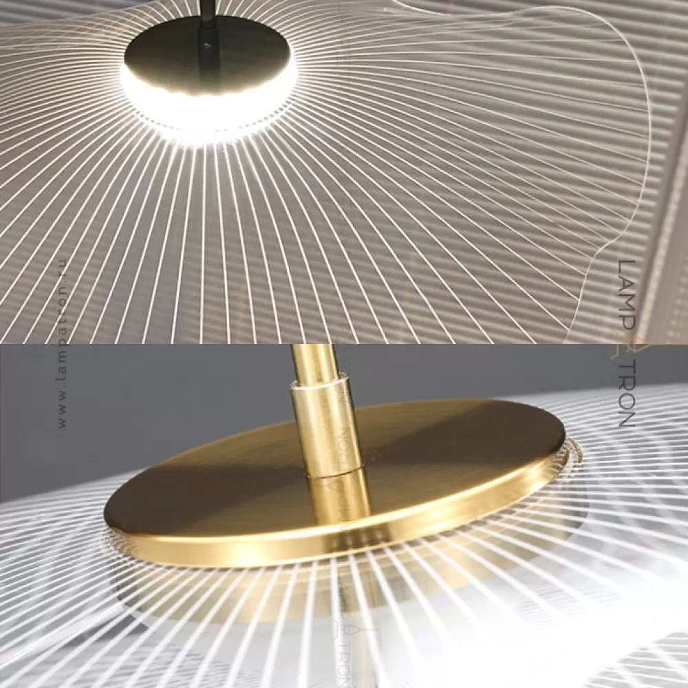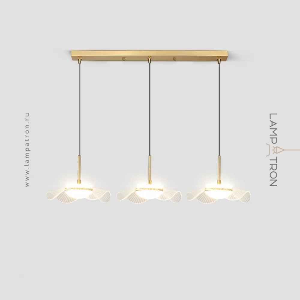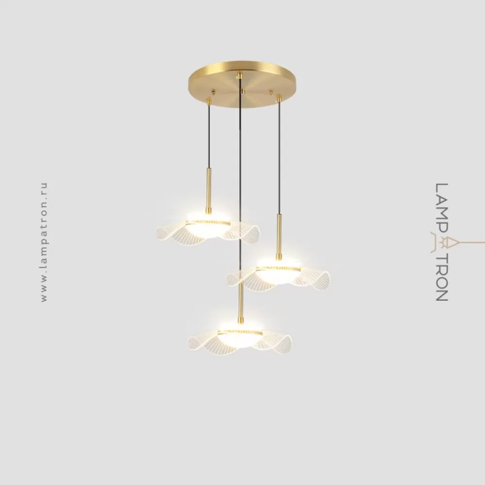 ROSEL-TRIO01. Комбинация. Материал: металл/акрил; цвет корпуса: латунь; размеры (диаметр × высота): цветок: Ø 25 × 8 см; потолочное крепление (ширина): 60 см; длина подвеса: 160 см; тип источника: LED матрица; цветовая температура: трехцветный свет; мощность: 36W; количество источников: 3