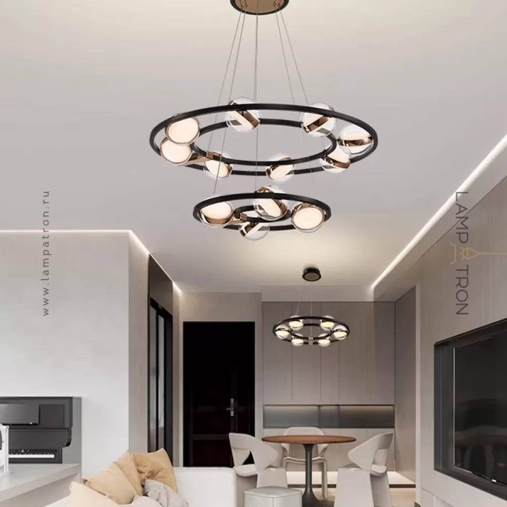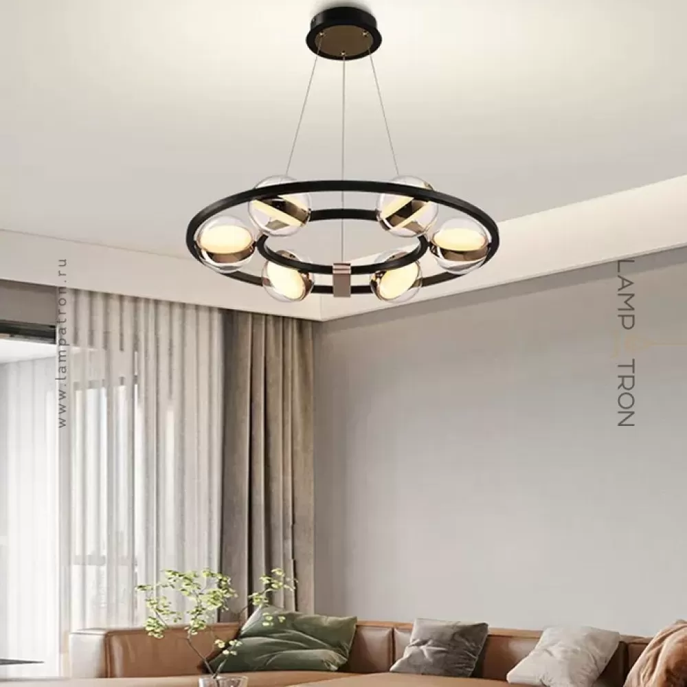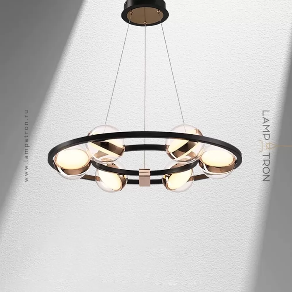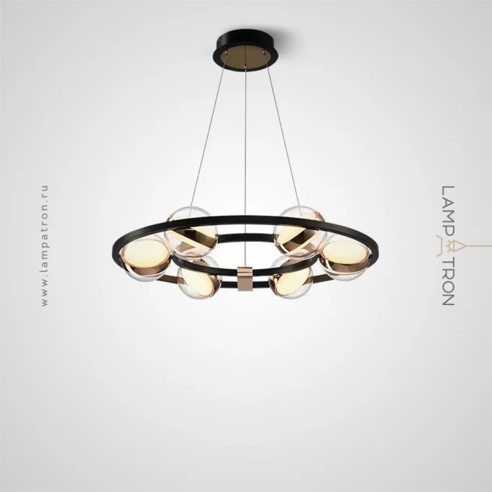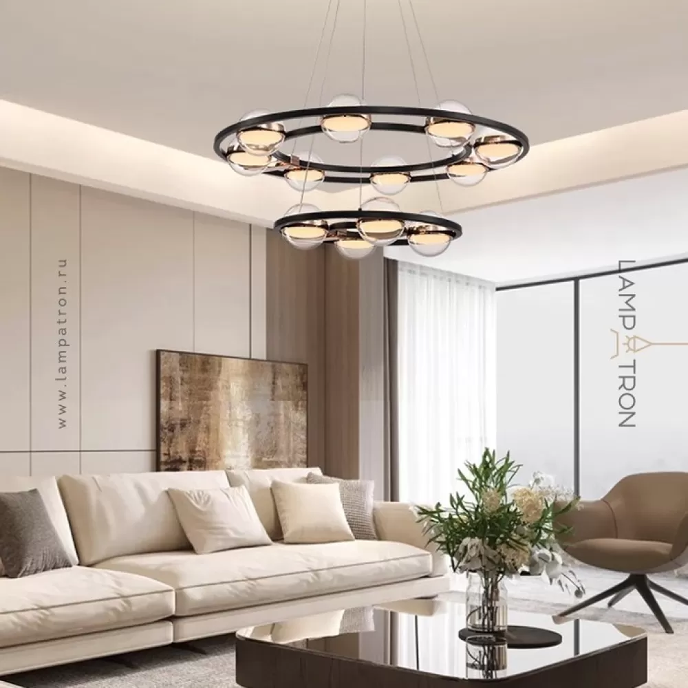 Серия кольцевых люстр на струнном подвесе с вращающимися плафонами в форме шара с декоративным металлическим ободом