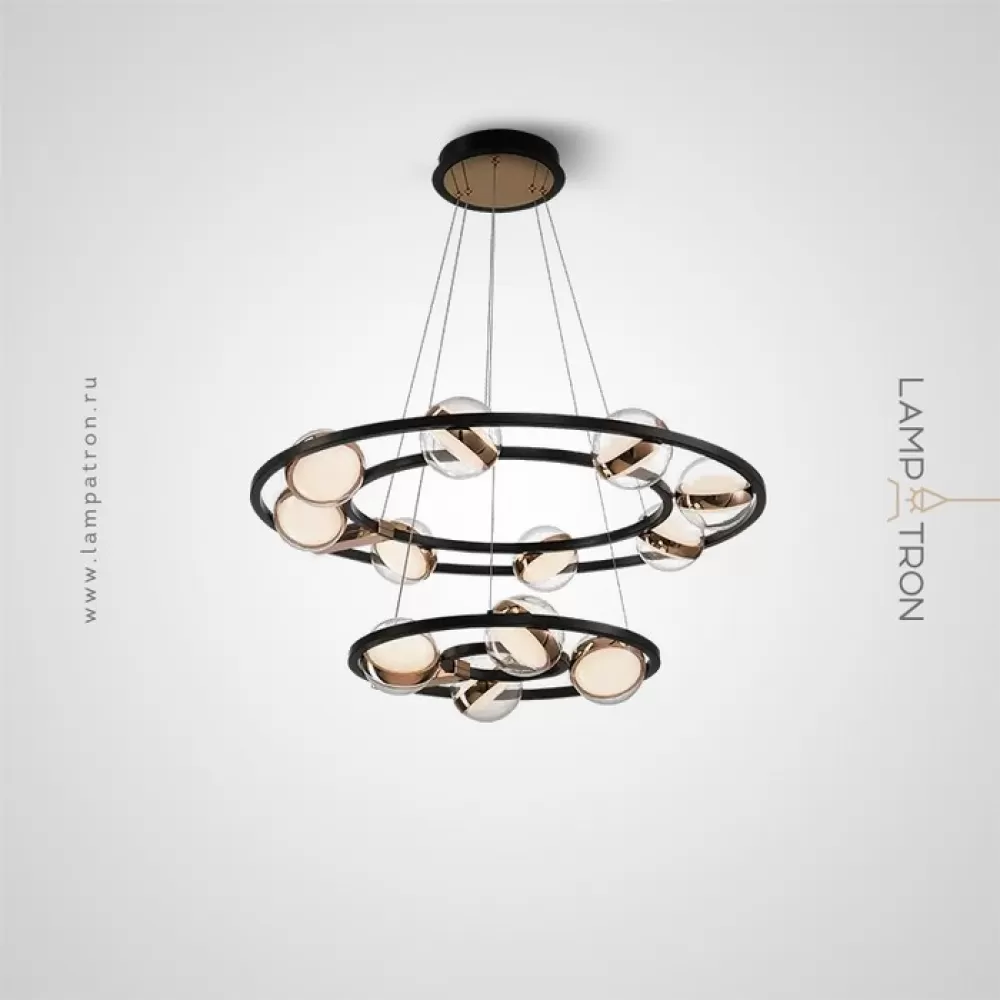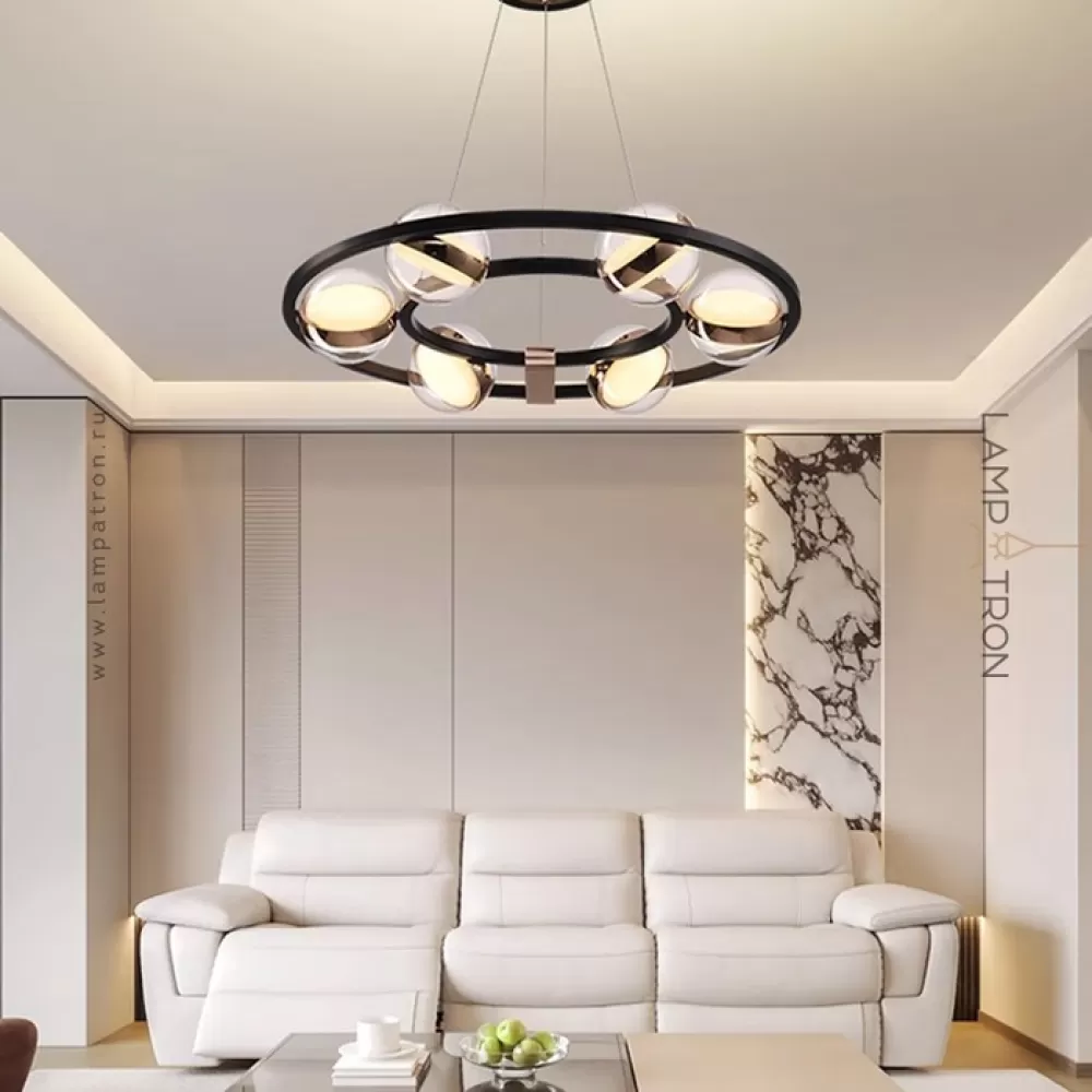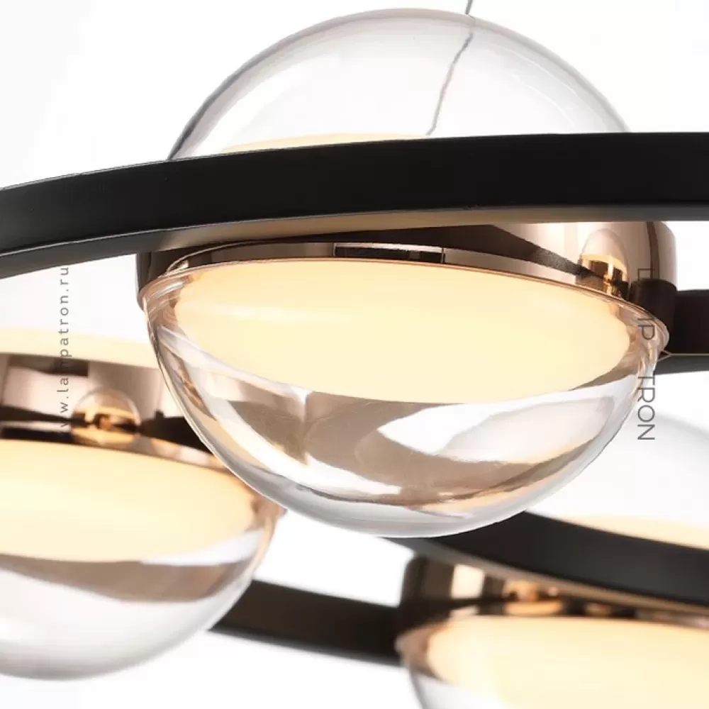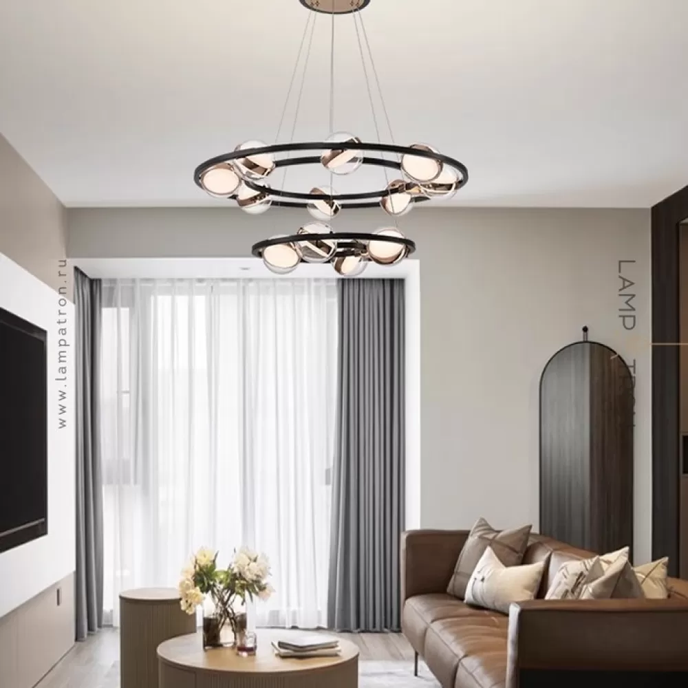 Серия кольцевых люстр на струнном подвесе с вращающимися плафонами в форме шара с декоративным металлическим ободом