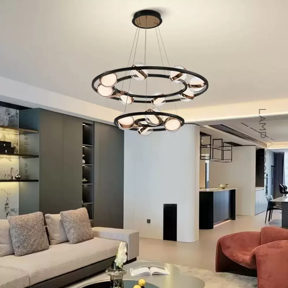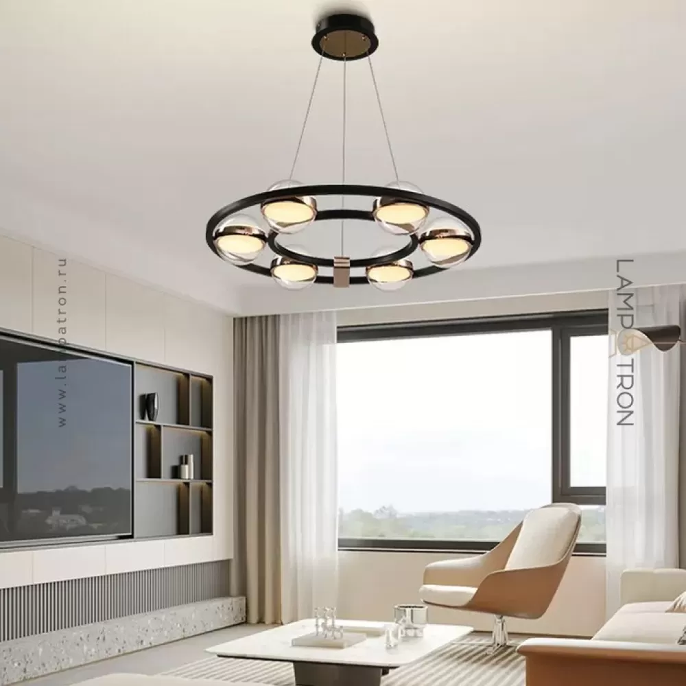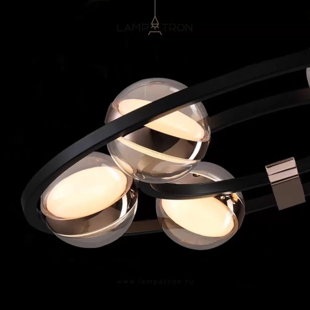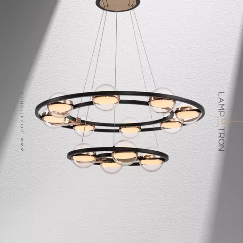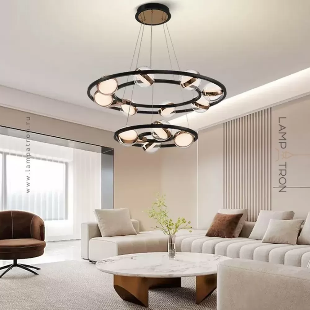 Серия кольцевых люстр на струнном подвесе с вращающимися плафонами в форме шара с декоративным металлическим ободом