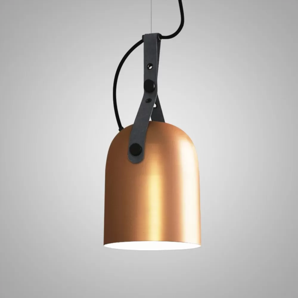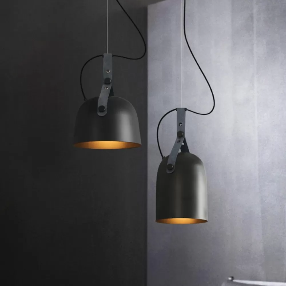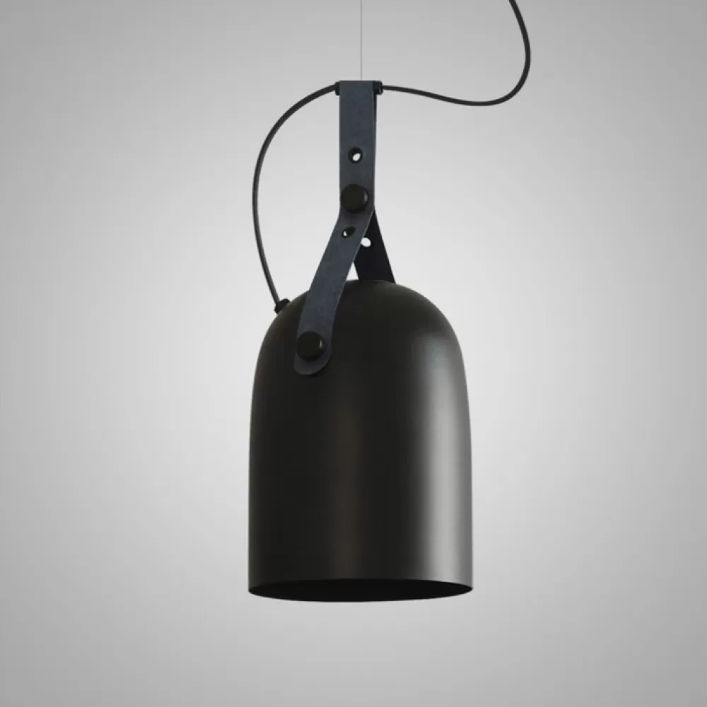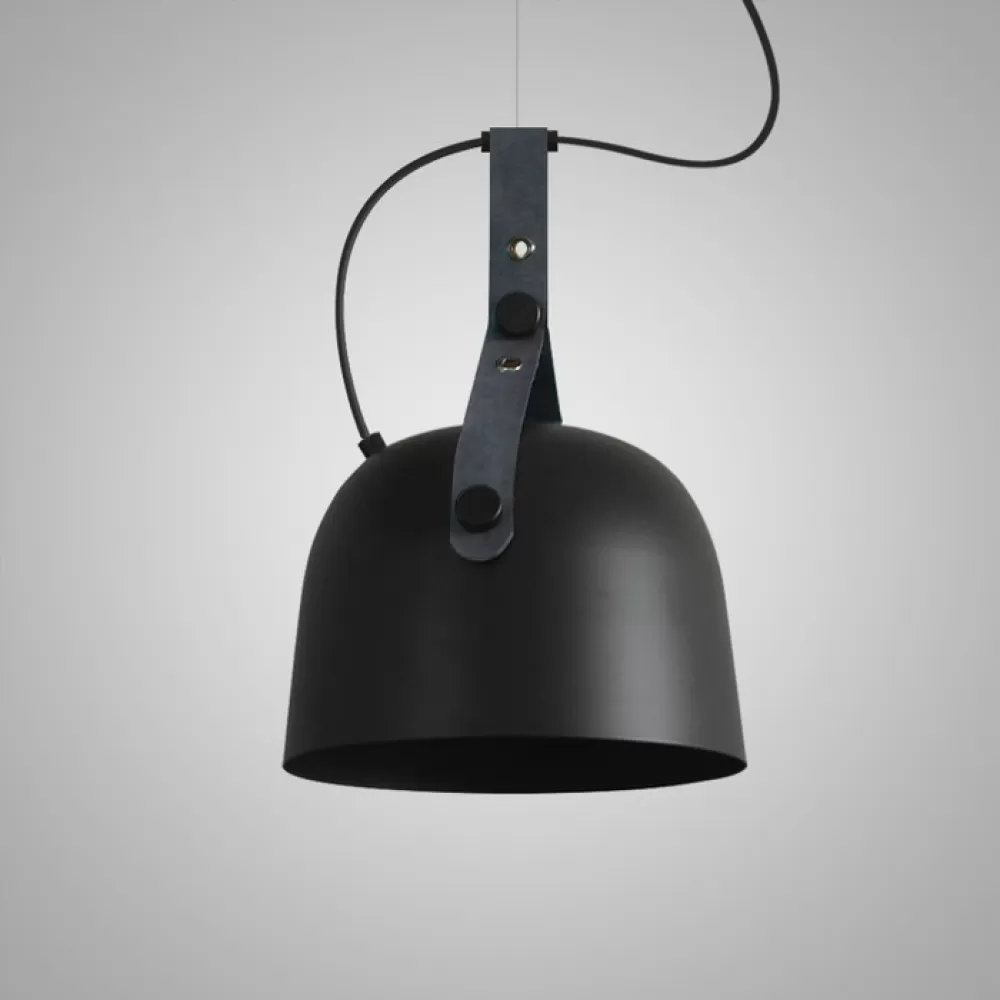 U01. Подвесной светильник. Материал: металл / экокожа; цвет: черный; размеры (диаметр × высота): Ø 18 × 23 см, с ремнем 40 см; потолочное крепление: Ø 10; длина провода: 150 см; тип цоколя: Е27; количество источников: 1