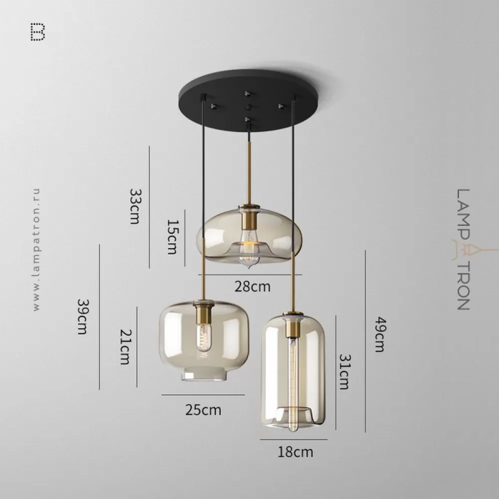VILMO-TRIO01. Подвесной светильник. Материал: металл / стекло; цвет плафона: янтарь; размеры: плафоны (длина × ширина): (31 × 29 см)+(28 × 15 см)+(18 × 31 см); потолочный диск (диаметр): Ø 40 см; длина провода: 150 см; тип цоколя: E27; кол-во источников: 3