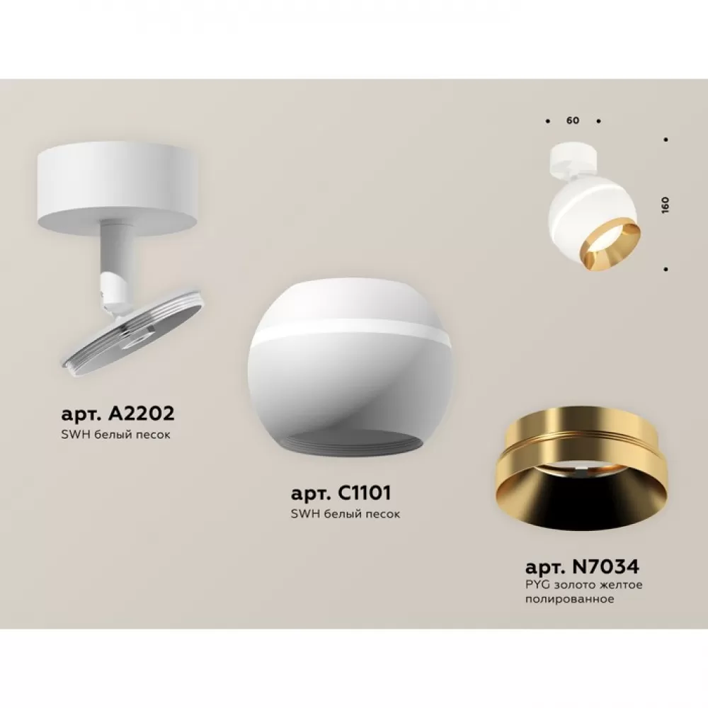 XM1101004 SWH/PYG белый песок/золото желтое полированное MR16 GU5.3 LED 3W 4200K (A2202,C1101,N7034) Комплект поворотного светильника с дополнительной подсветкой
